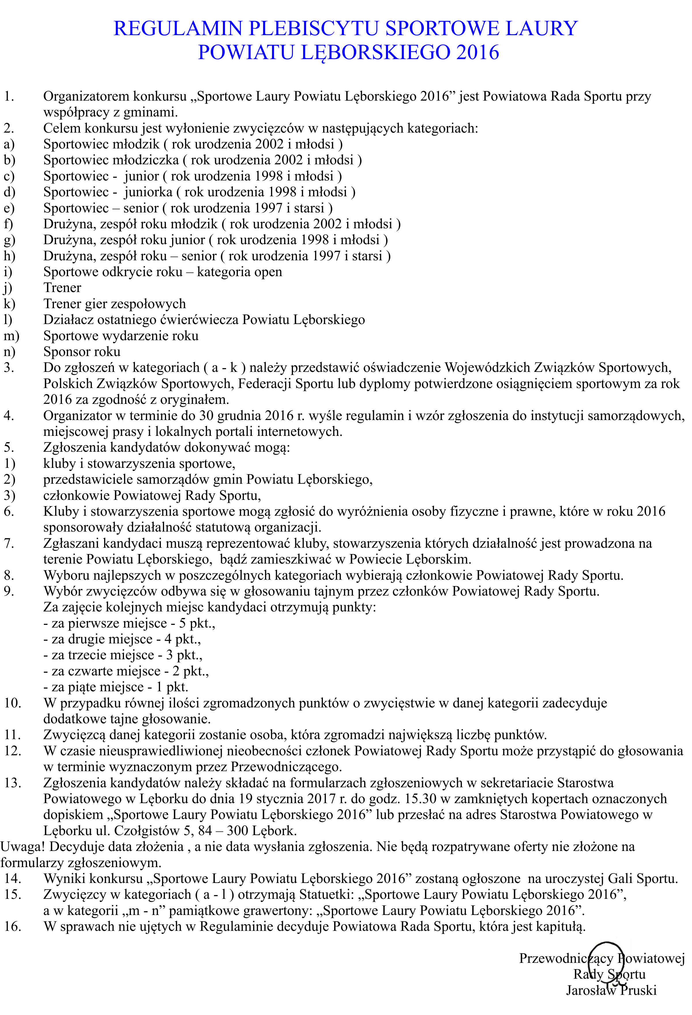 Zgłoszenia kandydatów do plebiscytu Sportowe Laury Powiatu Lęborskiego 2016 należy składać na formularzach zgłoszeniowych w sekretariacie Starostwa Powiatowego w Lęborku do dnia 19 stycznia 2017 r. do godz. 15.30 w zamkniętych kopertach oznaczonych dopiskiem „Sportowe Laury Powiatu Lęborskiego 2016” lub przesłać na adres Starostwa Powiatowego w Lęborku ul. Czołgistów 5, 84 – 300 Lębork.