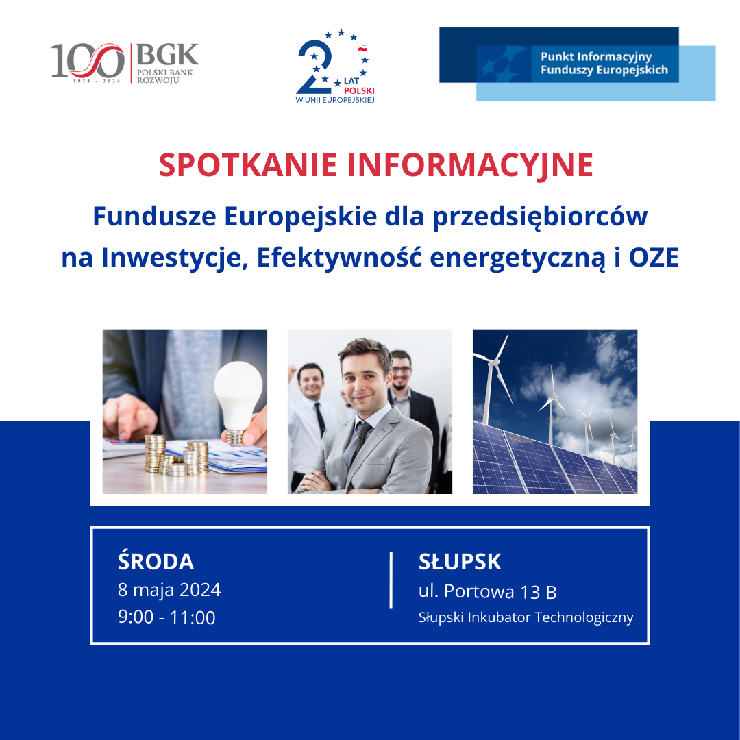 Lokalny Punkt Informacyjny Funduszy Europejskich w Słupsku wraz z Bankiem Gospodarstwa Krajowego zaprasza na spotkanie informacyjne poświęcone wsparciu dotacyjnemu w ramach działania Kredyt ekologiczny z programu Fundusze Europejskie dla Nowoczesnej Gospodarki (FENG).