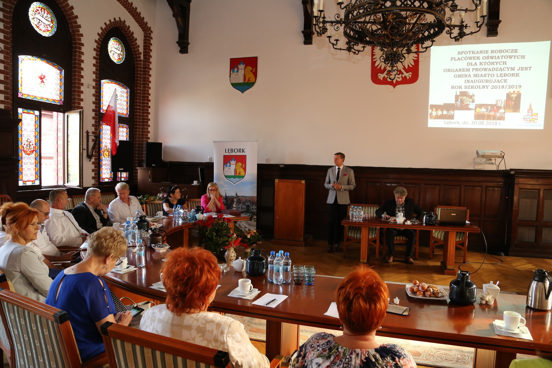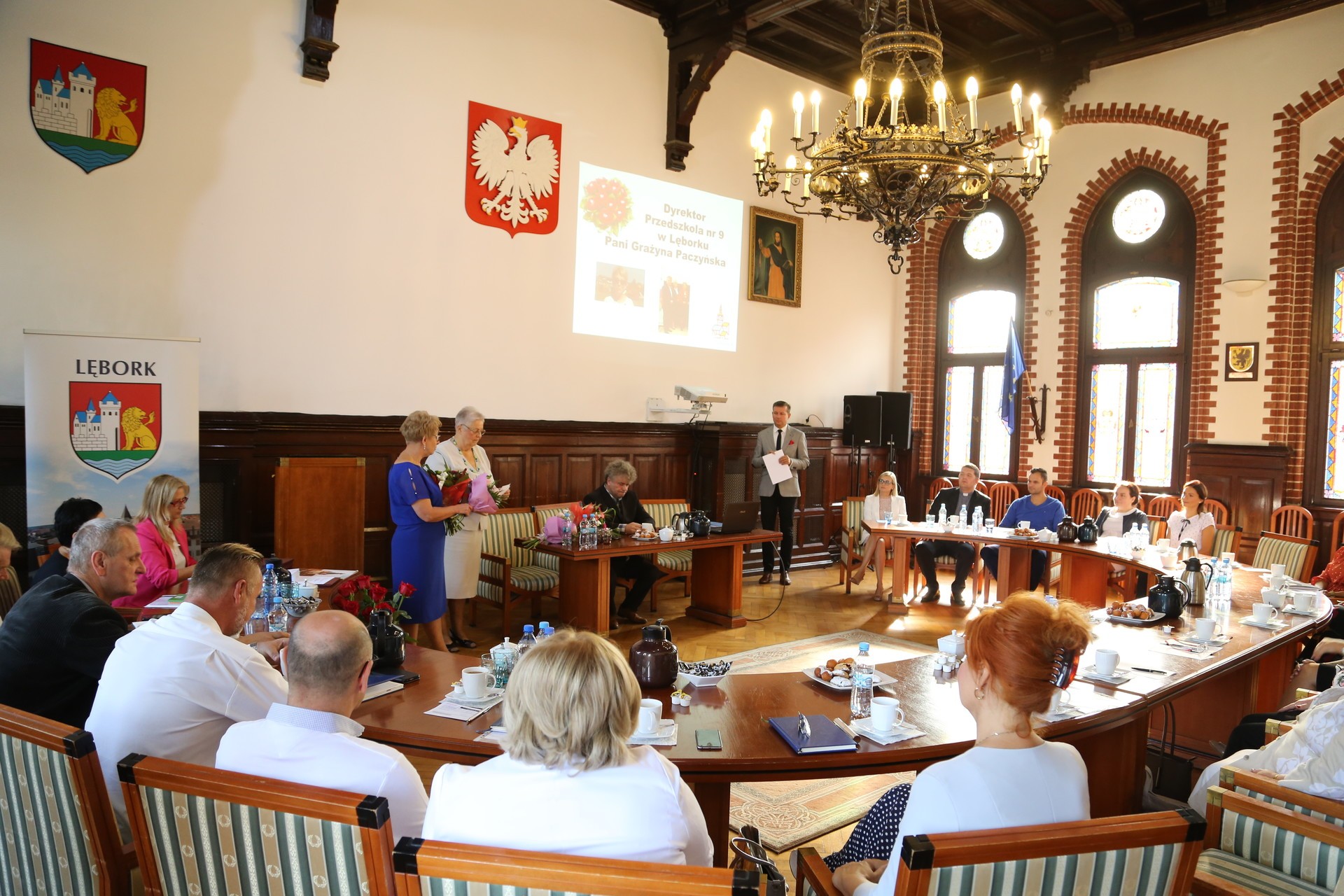30 sierpnia br. w ratuszu odbyło się spotkanie z dyrektorami lęborskich przedszkoli i szkół podstawowych oraz przedstawicieli związków zawodowych dot. funkcjonowania placówek oświatowych w roku szkolnym 2018/2019. Spotkanie było okazją do wzruszających pożegnań. Na emeryturę w tym roku przeszły Panie Dyrektor Przedszkola nr 9 Grażyna Paczyńska i Przedszkola nr 10 Małgorzata Grabowska.