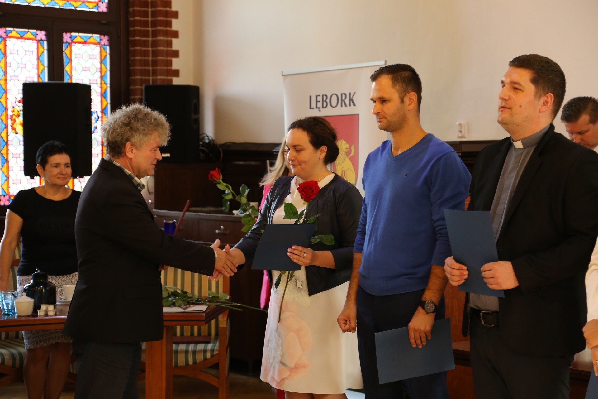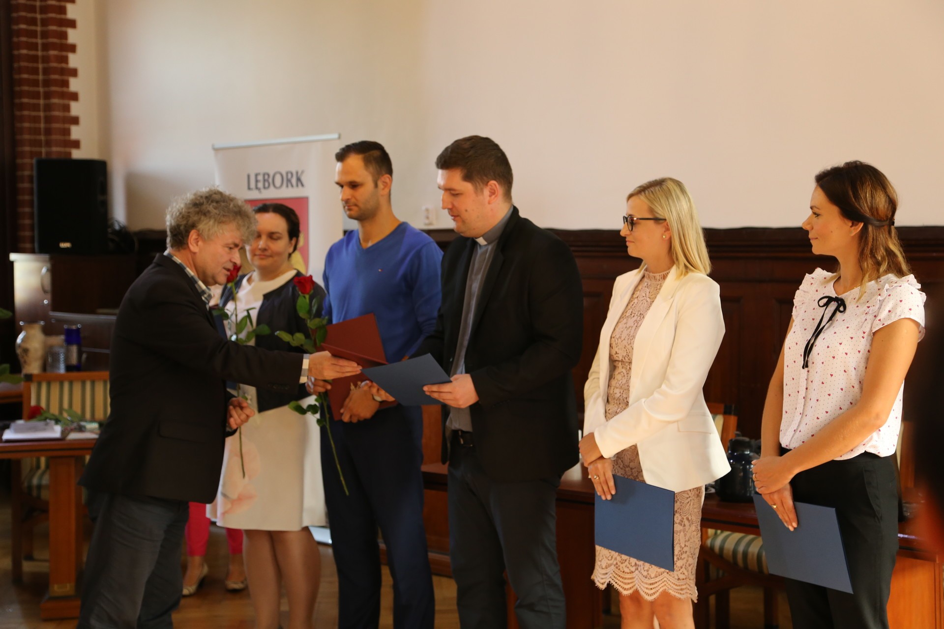Pięciu nauczycieli lęborskich szkół i przedszkoli otrzymało akty nadania stopnia awansu zawodowego na nauczyciela mianowanego (Justyna Dykowska, ks. Daniel Leszczyński, Michał Pietrzyk, Kamila Starczewska i Katarzyna Waśko).