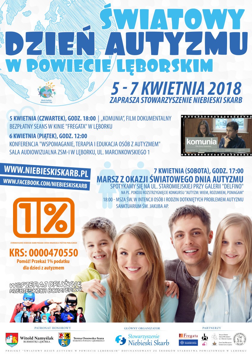 Stowarzyszenie Pomocy Osobom ze Spektrum Autyzmu „Niebieski Skarb” zaprasza do udziału w wydarzeniach Światowego Dnia Autyzmu w Powiecie Lęborskim. Impreza pod Honorowym Patronatem Burmistrza Lęborka organizowana jest już po raz piąty. W tym roku odbywać się będzie w dniach od 5 do 7 kwietnia 2018r.