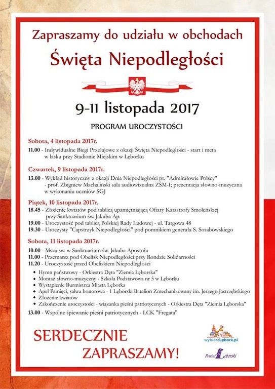 Z okazji rocznicy odzyskania niepodległości przez Polskę, w dniu Narodowego Święta Niepodległości 11 listopada o godz. 10.00 w Sanktuarium św. Jakuba Ap. odprawiona zostanie msza św., o godz.11.00 zaplanowany jest przemarsz pod Obelisk Niepodległości, a o 11.20 odbędzie się uroczystość pod Obeliskiem. W programie: Apel Pamięci i salwa honorowa, złożenie kwiatów, wystąpienie Burmistrza Lęborka, montaż słowno-muzyczny w wykonaniu uczniów SP nr 5, występ Orkiestry Dętej „Ziemia Lęborska”.