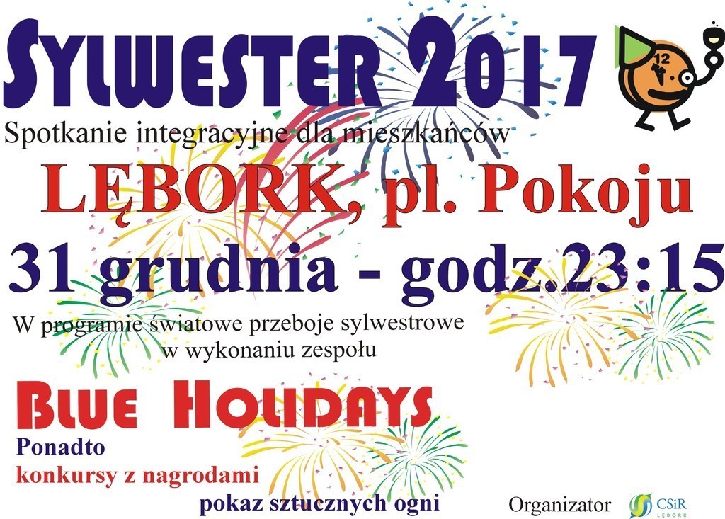 Około godz. 23.15 rozpocznie się koncert zespołu Blue Holidays, który zagra dla mieszkańców największe przeboje minionych lat. Pięć minut przed północą życzenia noworoczne złoży mieszkańcom Burmistrz Lęborka, a o północy niebo w centrum miasta rozświetli kilkuminutowy pokaz sztucznych ogni zsynchronizowany z muzyką. Po pokazie lęborczanie będą mogli dalej bawić z zespołem Blue Holidays.