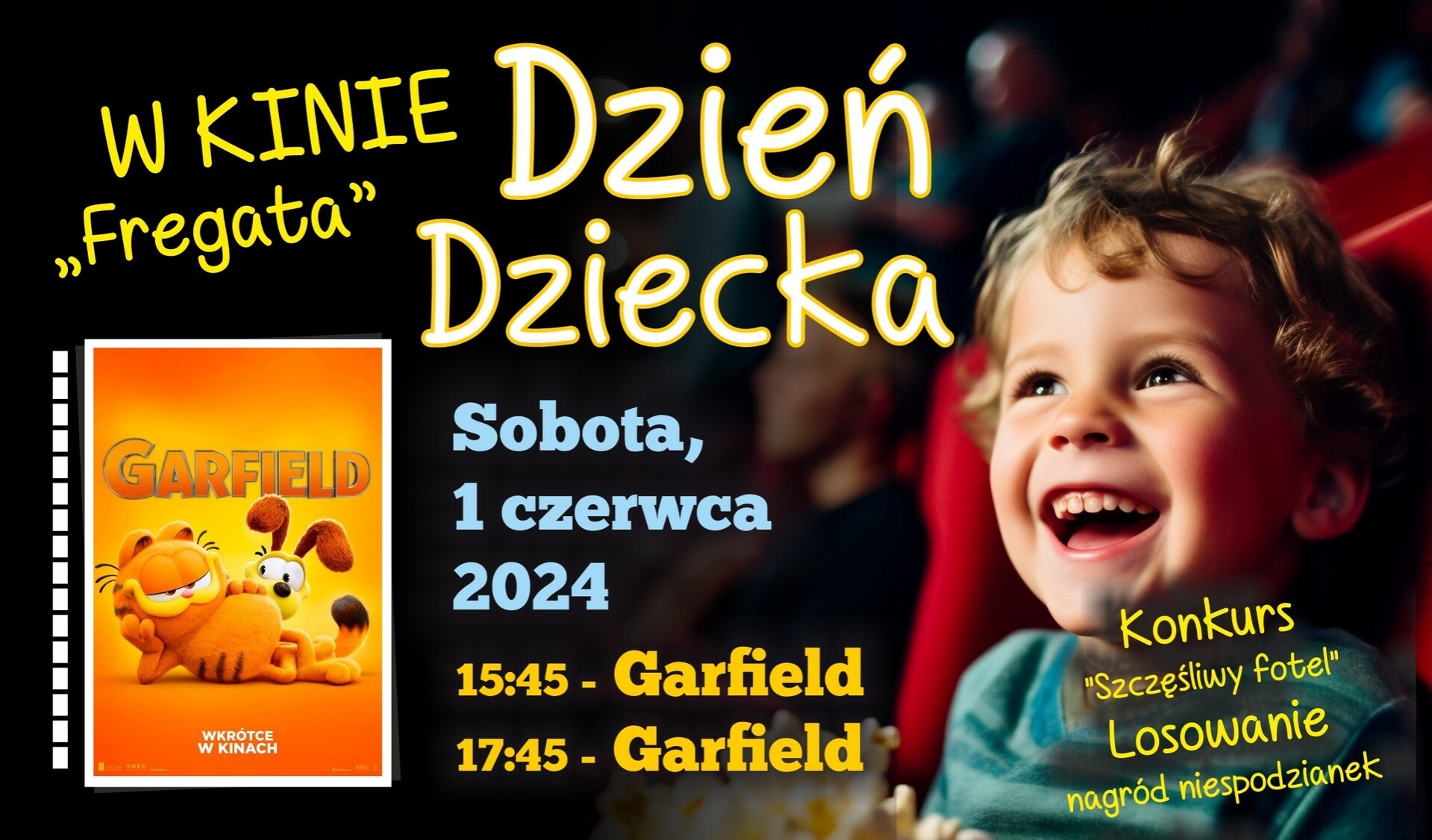 Lęborskie Centrum Kultury "Fregata" we współpracy z Kinads Media zaprasza najmłodszych widzów do udziału w zabawie "Szczęśliwy fotel". Zasady są proste - wystarczy, że 1 czerwca 2024 roku przyjdziecie na seans animacji "Garfield" o godzinie 15:45 oraz 17:45, zajmiecie miejsce i zajrzycie pod swój fotel - być może będzie to szczęśliwy fotel z niespodzianką.