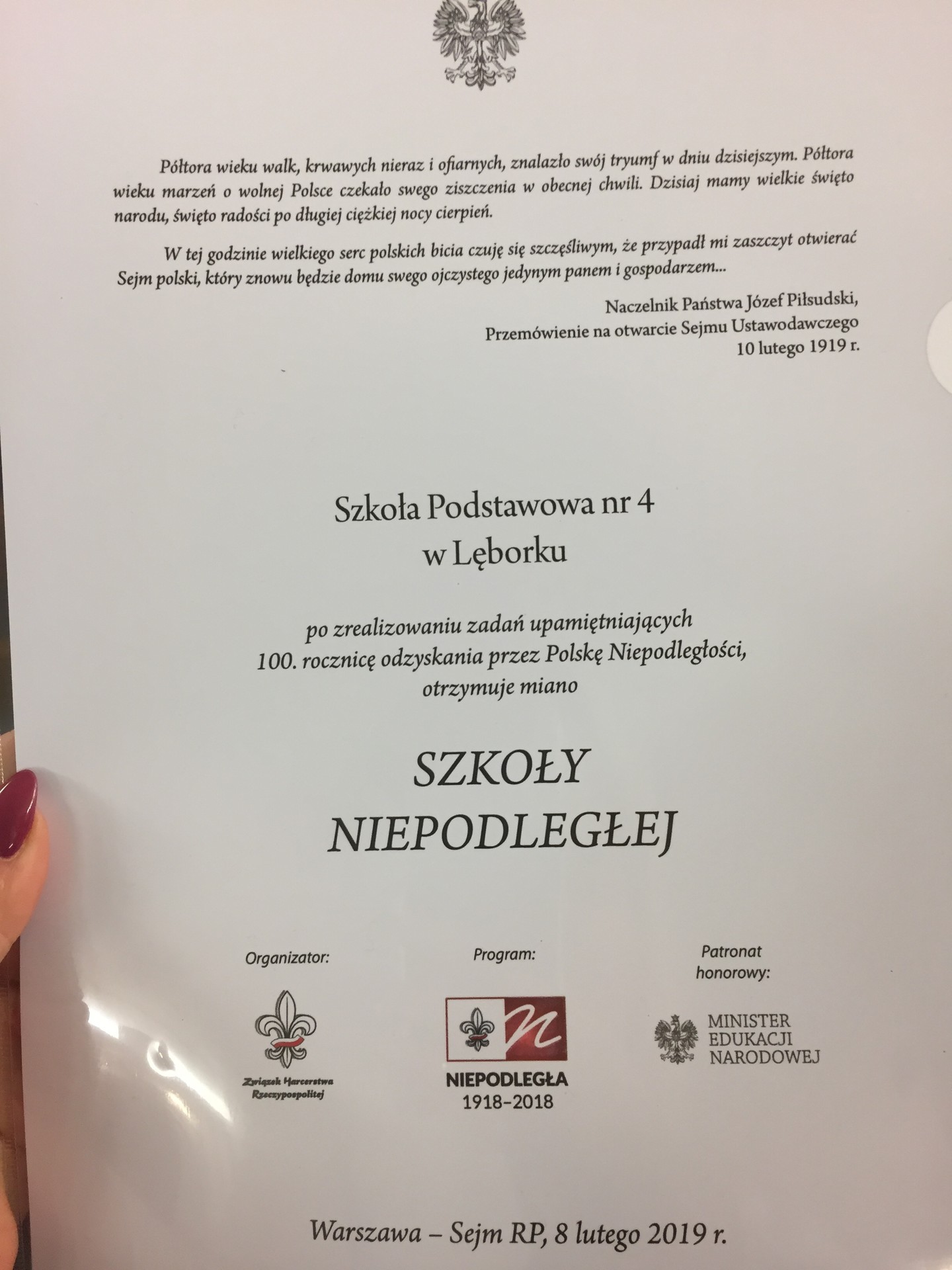 „Szkoła Niepodległej” - taki certyfikat przyznano 8 lutego 2019 r., podczas uroczystej Gali w Sali Kolumnowej Sejmu Rzeczypospolitej w Warszawie Szkole Podstawowej nr 4 w Lęborku.
