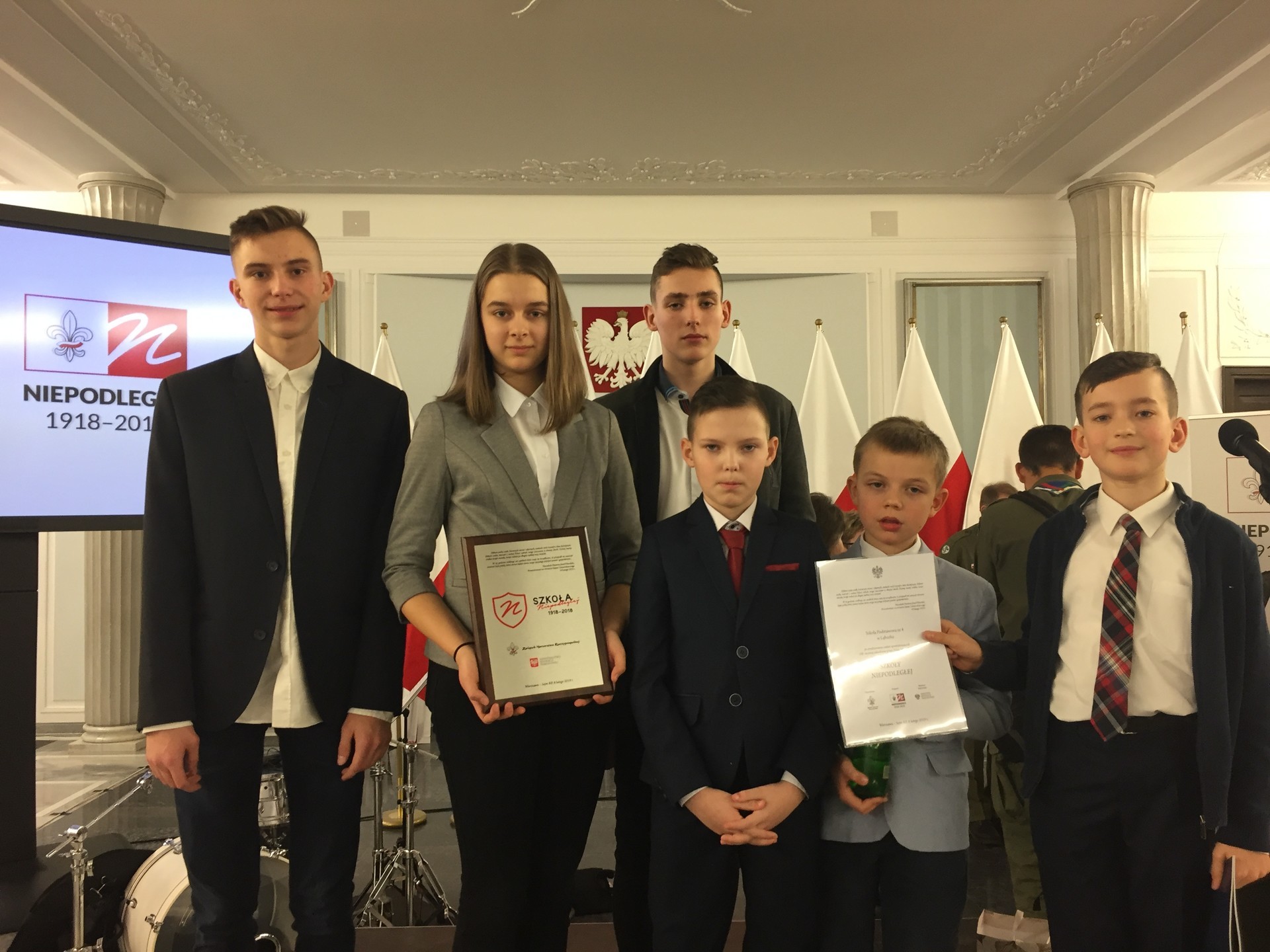 Dziesięć szkół, które w ocenie Komisji Konkursowej Niepodległa 1918 – 2018 wykonały zadania najambitniej, zostało wyróżnionych, otrzymało certyfikaty i dodatkowo nagrody specjalne ufundowane przez Ministerstwo Edukacji Narodowej. W tej 10-tce równorzędnie wyróżnionych szkół znalazła się Szkoła Podstawowa nr 4 w Lęborku, której 9-osobowa delegacja w składzie: Wicedyrektor Jadwiga Nadworska, opiekun projektu Halina Andryskowska-Dudek, opiekun SU Beata Frączek i sześciu najlepszych uczniów w szkole: Juliusz Grudzina, Jakub Gliszczyński, Mateusz Dudek, Jakub Smolik, Małgorzata Klawikowska, Jakub Radomski - wzięła udział w uroczystej Gali Szkół Niepodległej w Sejmie Rzeczypospolitej w Warszawie i odebrała nagrodę specjalną – tablicę interaktywną, albumy, książki i gry.