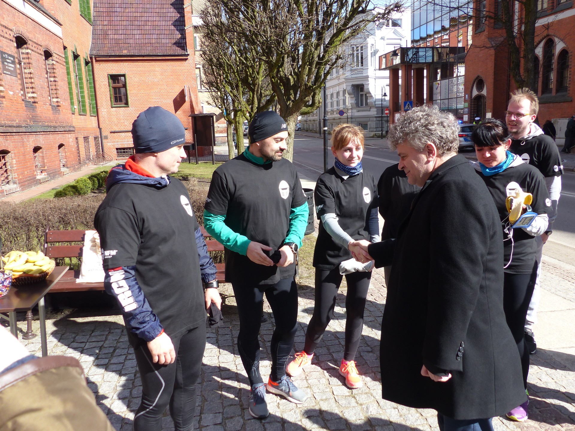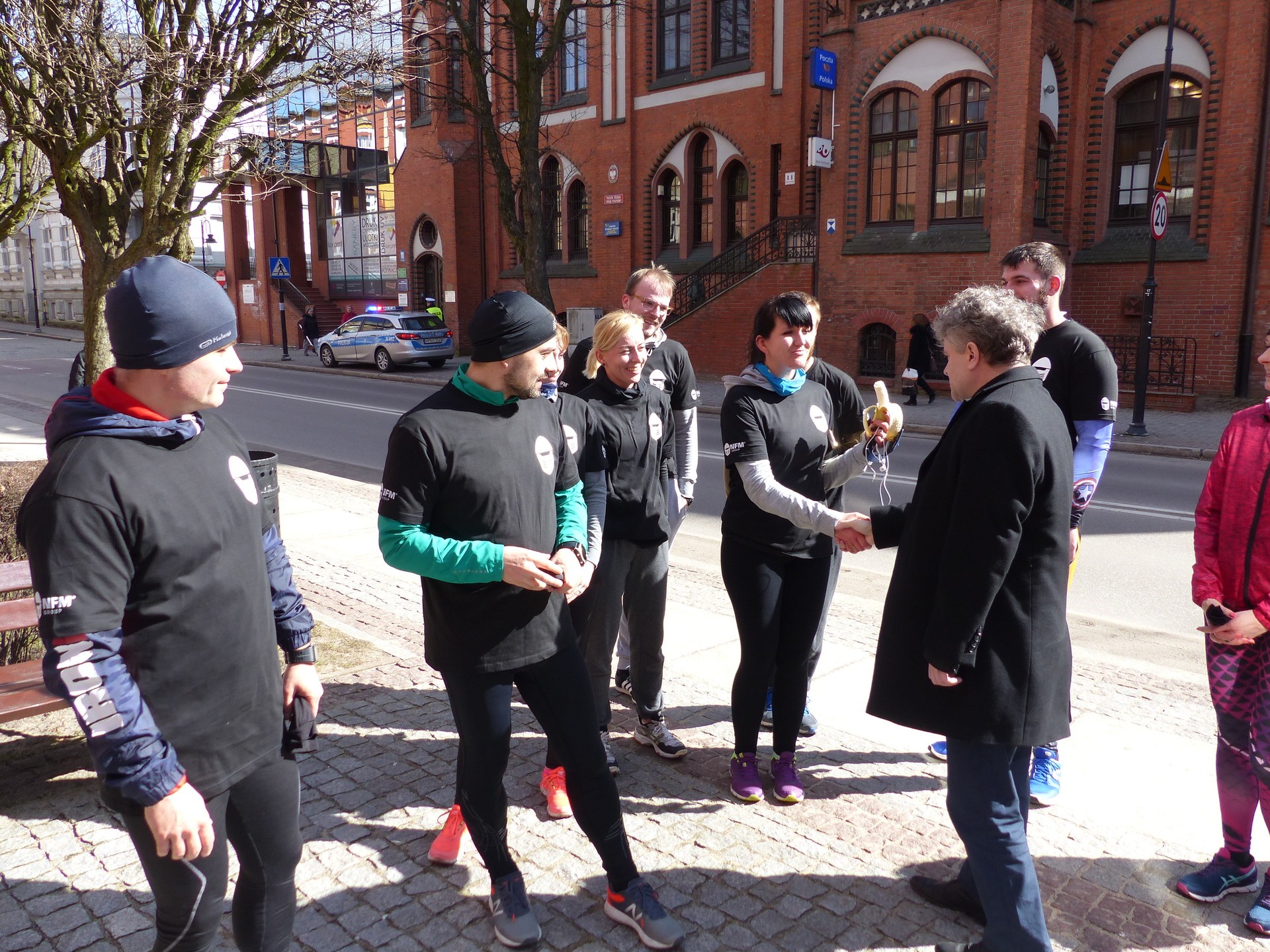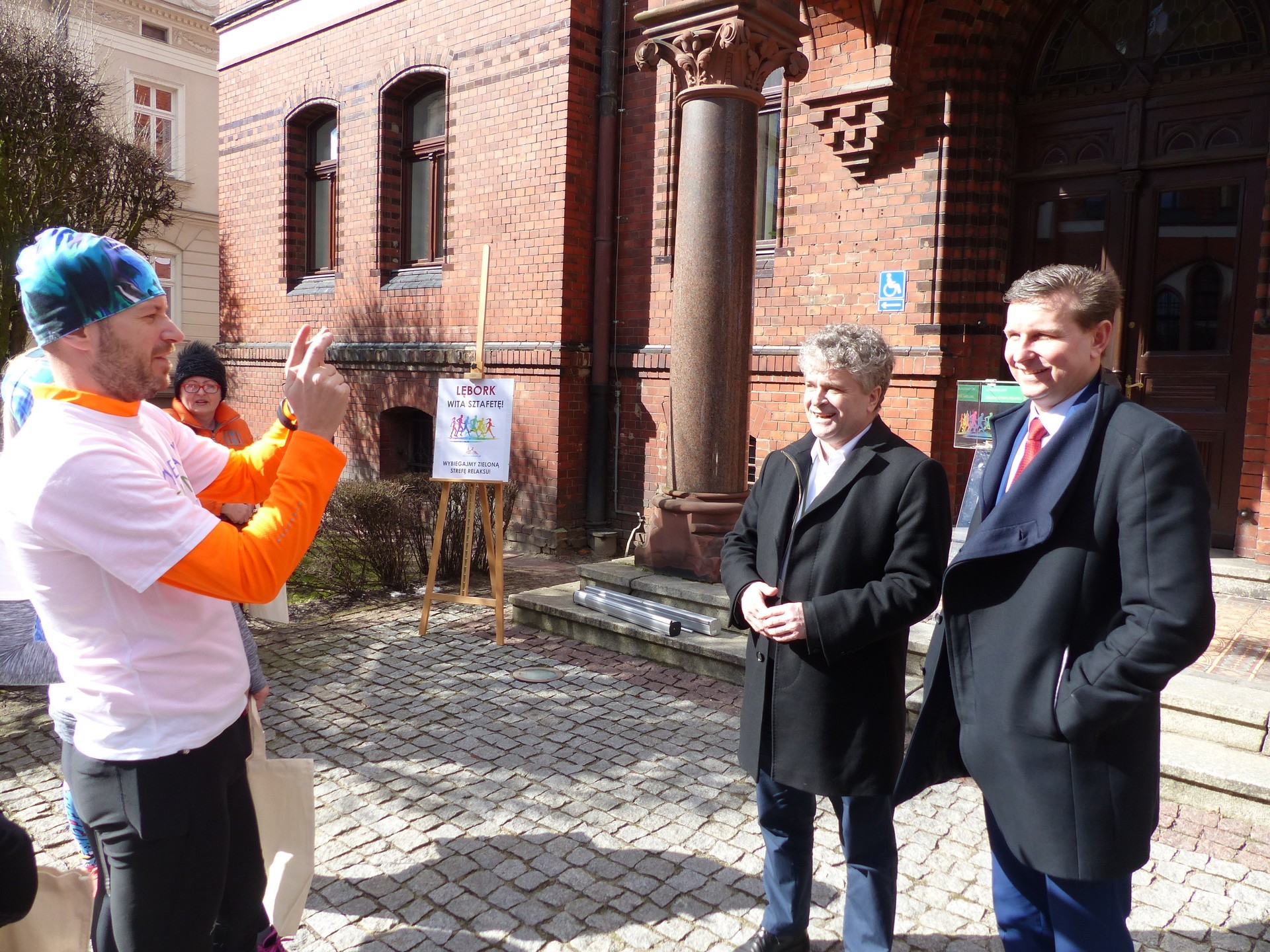 21 marca w Lęborku gościliśmy uczestników sztafetowego biegu charytatywnego „Wybiegajmy Zieloną Strefę Relaksu”. Do sztafety z Tczewa na rogatkach miasta dołączyli biegacze, pracownicy firm wspierających inicjatywę z Farm Frites Poland, NFM Production i Urzędu Miejskiego w Lęborku. W kilkunastoosobowej eskorcie sztafeta dotarła pod ratusz. Rozbieganych gości powitał Burmistrz Lęborka, przekazana została też skarbonka do której przez tydzień mieszkańcy i pracownicy firm zaangażowanych w przedsięwzięcie wrzucali datki. Celem biegu sztafetowego jest zebranie środków na budowę miejsca relaksu przy Zespole Placówek Specjalnych w Tczewie. Podczas spotkania pod ratuszem znalazł się czas na odpoczynek, uzupełnienie płynów i rozmowy. Następnie w asyście policji sztafeta i nasi lokalni biegacze wyruszyli w kierunku Wejherowa.