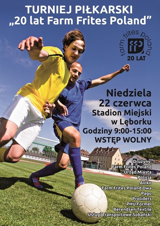 Firma Farm Frites Poland S.A. zaprasza na turniej piłkarski "20 lat Farm Frites Poland", który odbędzie się 22 czerwca o godz. 9.00 na Stadionie Miejskim w Lęborku.