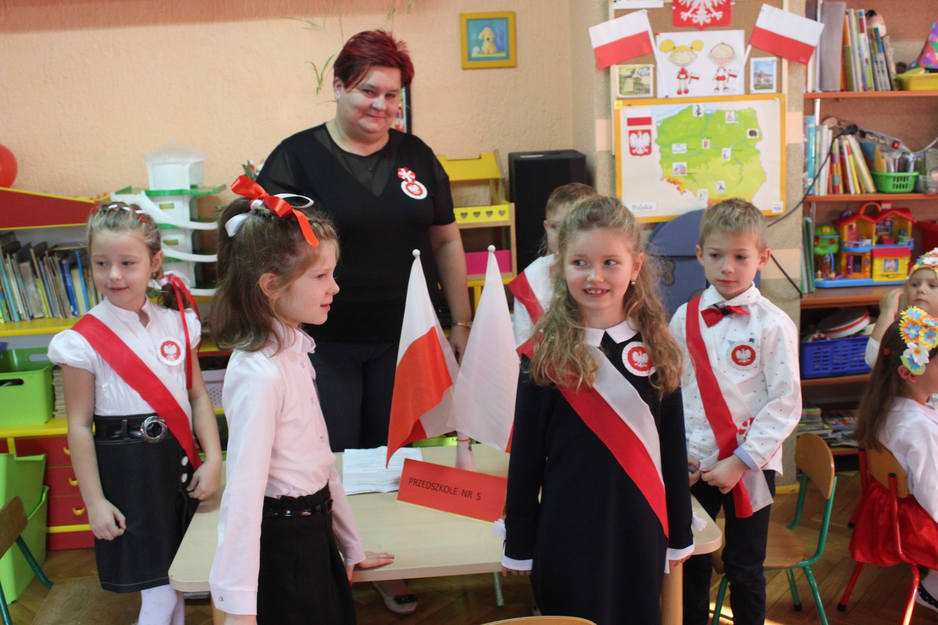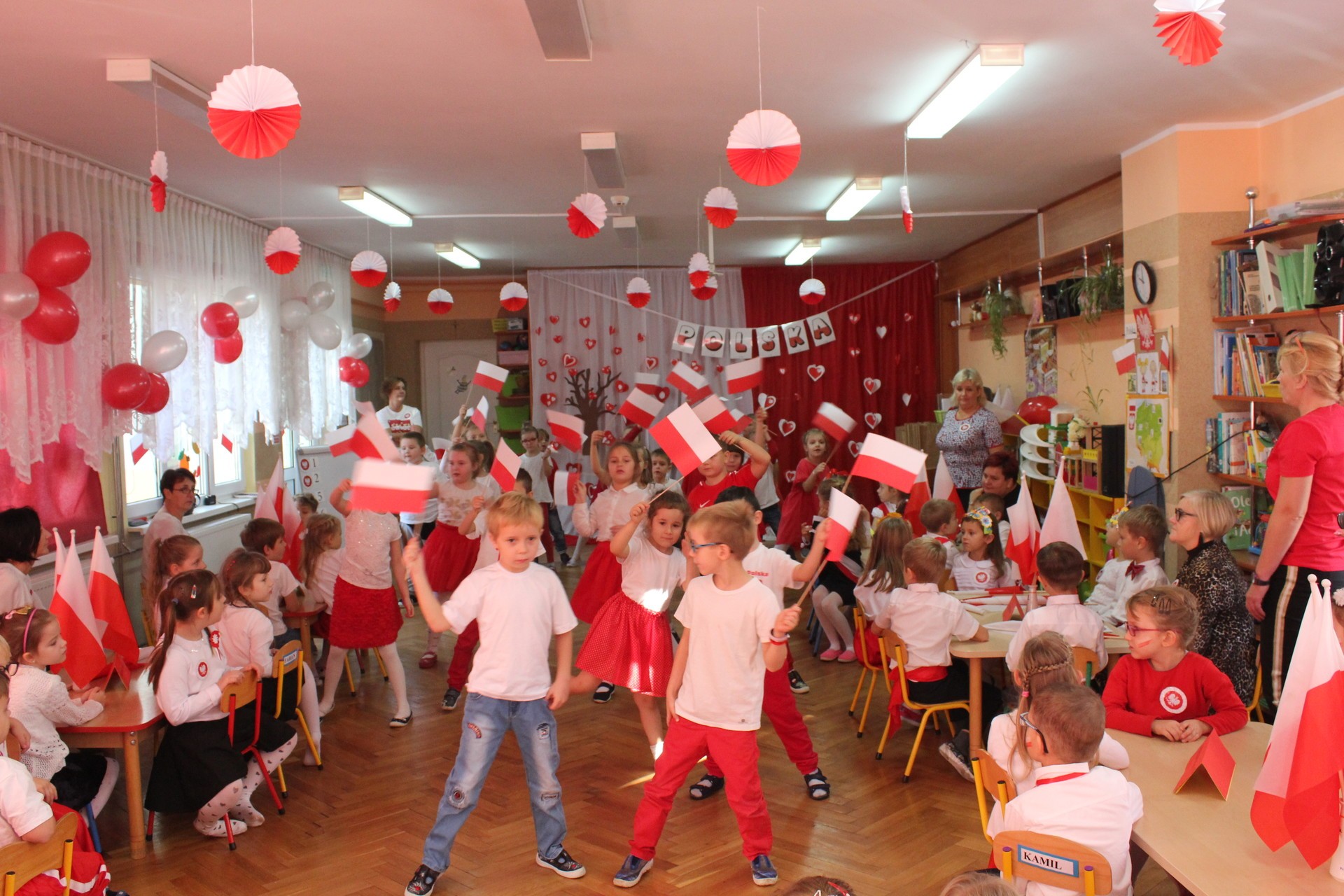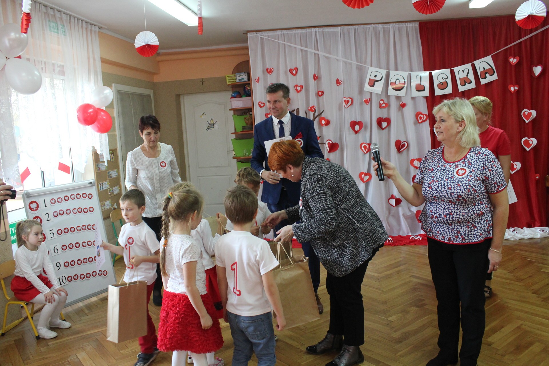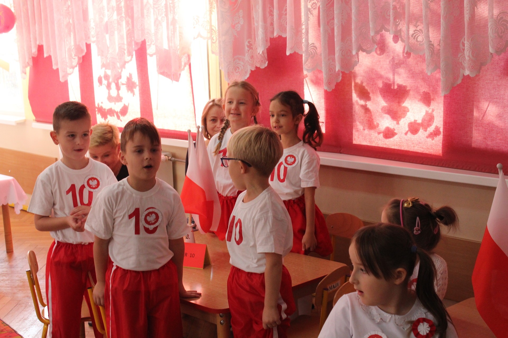 Przedszkolaki miały do wykonania zadania sprawnościowe oraz zadania związane z historią naszego państwa. Dzieci śpiewały piosenki z okazji setnej rocznicy odzyskania przez Polskę niepodległości, nie zabrakło również zabaw muzyczno-ruchowych.
