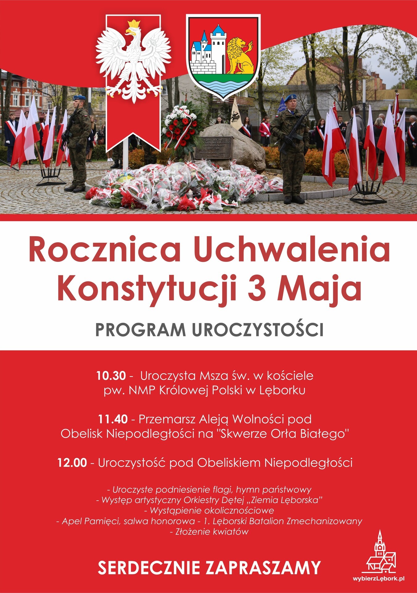 W dniu 3 maja Lębork przygotowuje się do obchodów ważnych momentów w historii Polski - uchwalenia Konstytucji 3 Maja oraz Dnia Flagi Rzeczypospolitej Polskiej. Uroczystości rozpoczną się od uroczystej mszy św. odpustowej o godzinie 10:30 w kościele pw. NMP Królowej Polski.