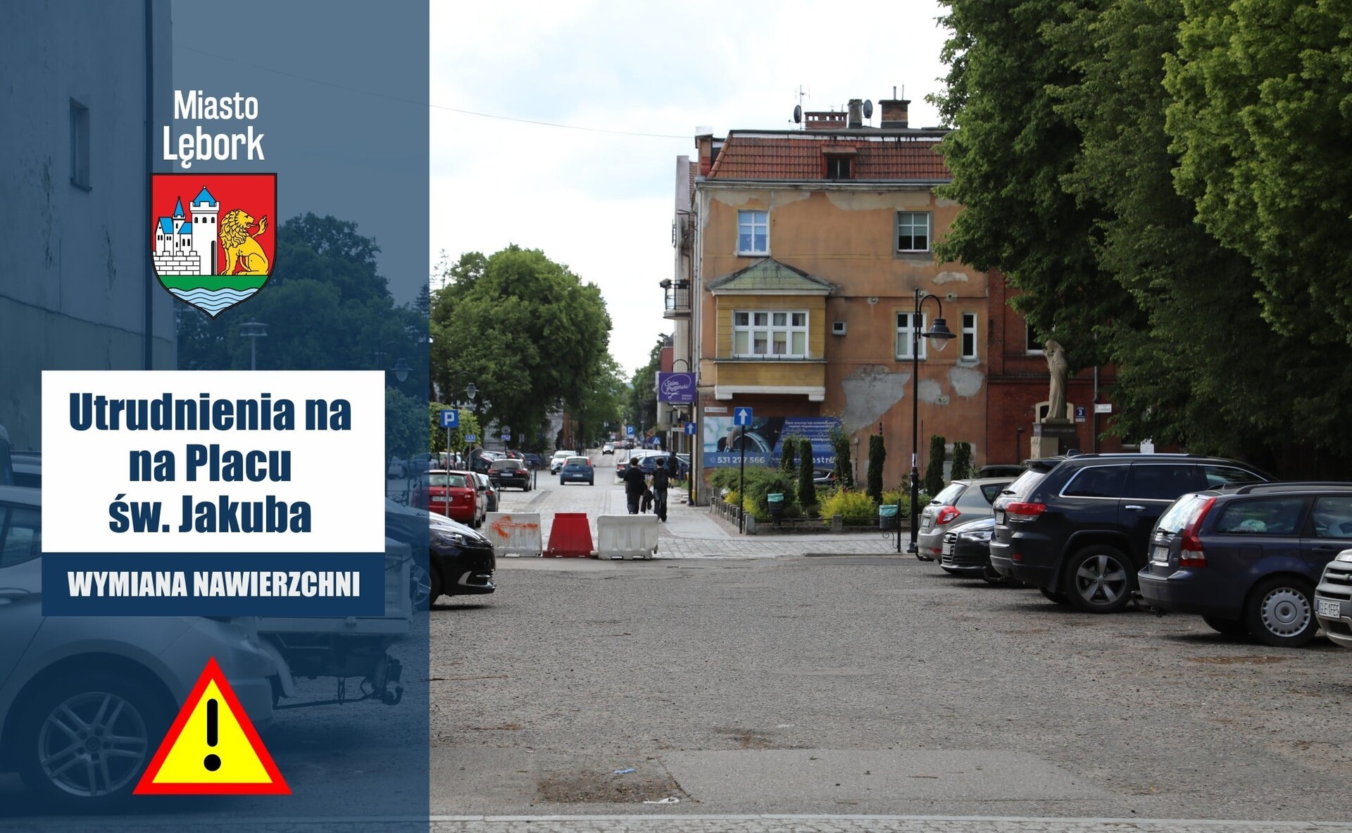 Informujemy, że od jutra, 5 czerwca 2025 r., na Placu św. Jakuba w Lęborku (przy ul. Chodukiewicza, przed Sanktuarium św. Jakuba Ap.) rozpoczną się prace drogowe związane z wymianą nawierzchni. W związku z realizacją robót wystąpią czasowe utrudnienia w ruchu oraz brak możliwości parkowania w tym rejonie. Za utrudnienia przepraszamy i prosimy o wyrozumiałość.