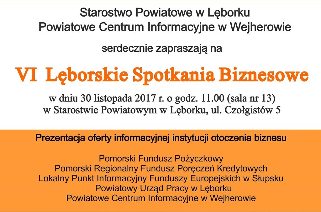 W czwartek 30 listopada 2017 r. o godz. 11 w sali nr 13 Starostwa Powiatowego w Lęborku odbędzie się szósta edycja Lęborskich Spotkań Biznesowych. W programie m. in. prezentacja oferty informacyjnej instytucji otoczenia biznesu, stoliki eksperckie prelegentów i indywidualne konsultacje.