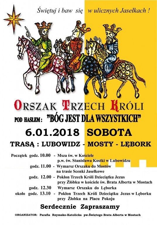 Parafie Świętego Brata Alberta w Mostach i Św. Jakuba Ap. w Lęborku zapraszają na VI Orszak Trzech Króli w dniu 6 stycznia 2018 roku. Hasłem tegorocznego Orszaku są słowa ”Bóg jest dla wszystkich”. Orszak przejdzie z Lubowidza przez Mosty do Lęborka, na Plac Pokoju. Msza Św. rozpocznie się o godz. 10.00 w Lubowidzu. Ok. godz. 11.00 nastąpi wymarsz Orszaku w kierunku Mostów. Powitanie Trzech Króli na Placu Pokoju około godziny 13.00.