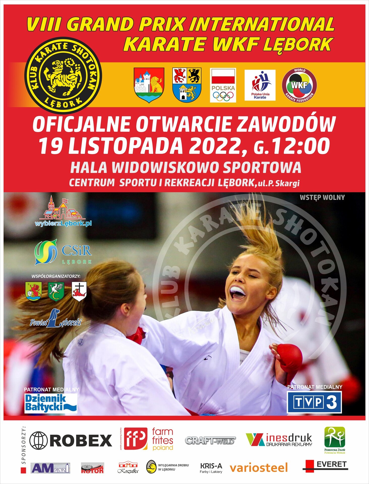 Klub Karate Shotokan w Lęborku oraz Miasto Lębork zapraszają na zawody VII Grand Prix International Karate WKF. Start zawodów w Hali Widowiskowo-Sportowej przy ul. P. Skargi 19 listopada 2022 o godz. 12.00.