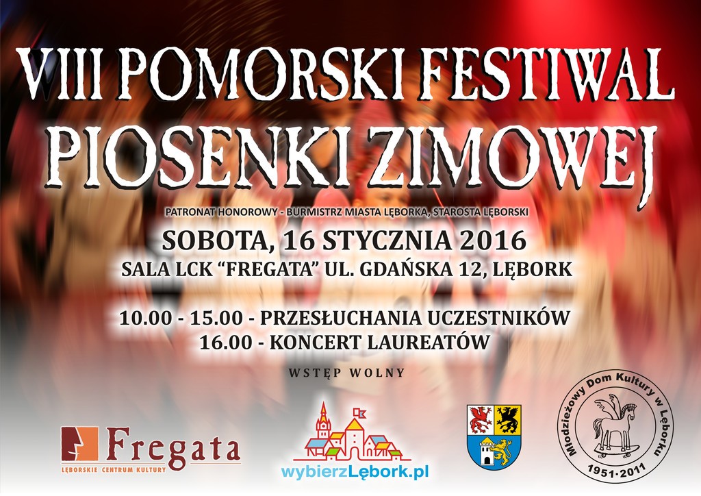 Młodzieżowy Dom Kultury w Lęborku i Lęborskie Centrum Kultury „Fregata” zapraszają na VIII Pomorski Festiwal Piosenki Zimowej. Impreza pod patronatem Burmistrza Miasta Lęborka i Starosty Powiatu Lęborskiego odbędzie się w sobotę 16 stycznia 2016 roku. Przesłuchania wokalistów rozpoczną się o godzinie 10.00. Koncert galowy najlepszych uczestników o godzinie 16.00.