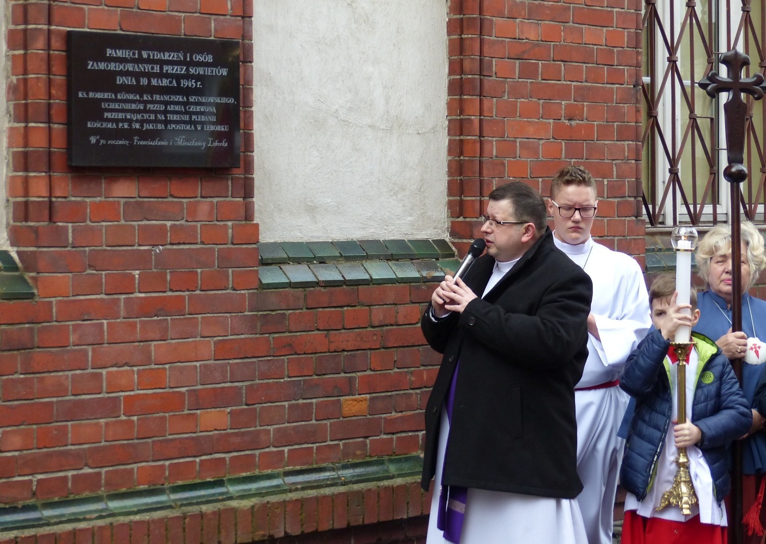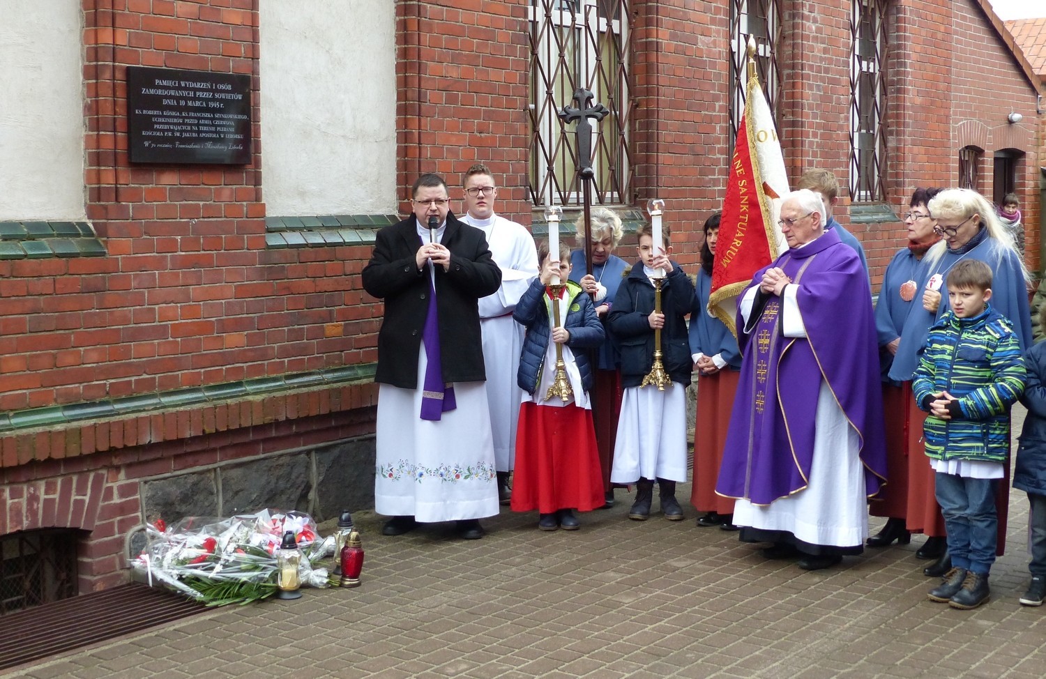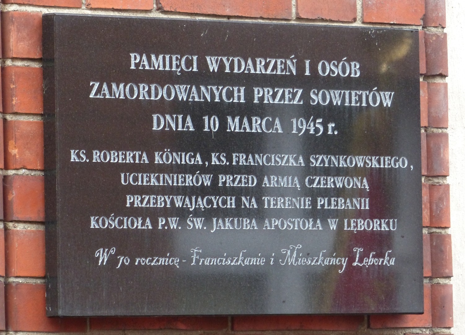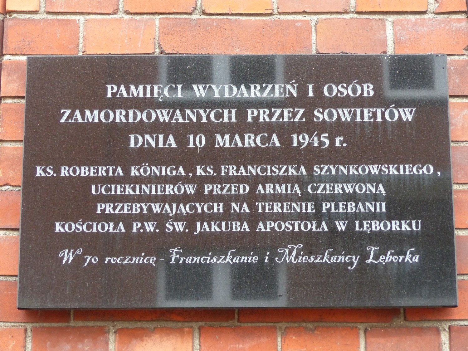 10 marca br. w Sanktuarium św. Jakuba Ap. odprawiona została Msza Św. w intencji księży i innych osób zamordowanych przez Sowietów 74 lata temu, na terenie plebanii kościoła oraz ludności cywilnej miasta. Po mszy i krótkiej modlitwie złożono kwiaty i zapalono znicze pod tablicą umieszczoną na budynku klasztoru parafii św. Jakuba Ap. Napis na tablicy brzmi: „Pamięci wydarzeń i osób zamordowanych przez Sowietów 10 marca 1945: ks. Roberta Königa, ks. Franciszka Szynkowskiego, uciekinierów przed Armią Czerwoną przebywających na terenie plebanii kościoła”.