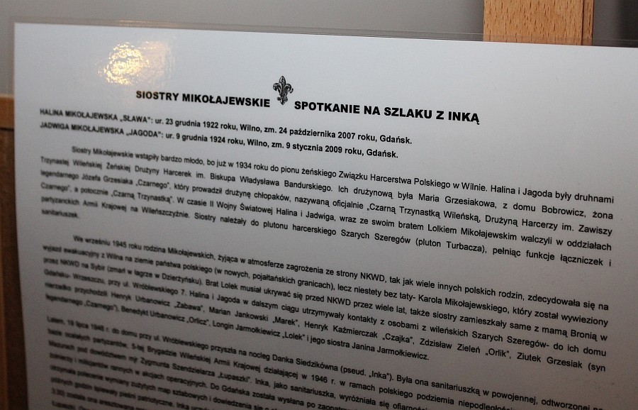 Sanktuarium św. Jakuba Ap. było miejscem otwarcia wystawy „Żołnierzom Wyklętym…”. Dla młodej absolwentki Akademii Sztuk Pięknych w Gdańsku Agnieszki Marszk rodzinna historia była inspiracją wykonania pracy dyplomowej o Żołnierzach Wyklętych w tym „Ince”. Babcia i ciocia Agnieszki Marszk – Halina i Jadwiga Mikołajewskie były świadkami zatrzymania przez Urząd Bezpieczeństwa Danuty Siedzikówny „Inki” w ich mieszkaniu, notabene w którym autorka prac się wychowała. To właśnie ostatnie słowa, gryps „Inki’ przez egzekucją „Powiedzcie mojej babci, że zachowałam się jak trzeba” skierowany był do sióstr Mikołajewskich. Znajomość z „Inką” przepłaciły więzieniem. Wystawę można oglądać w Sanktuarium przez najbliższy tydzień.