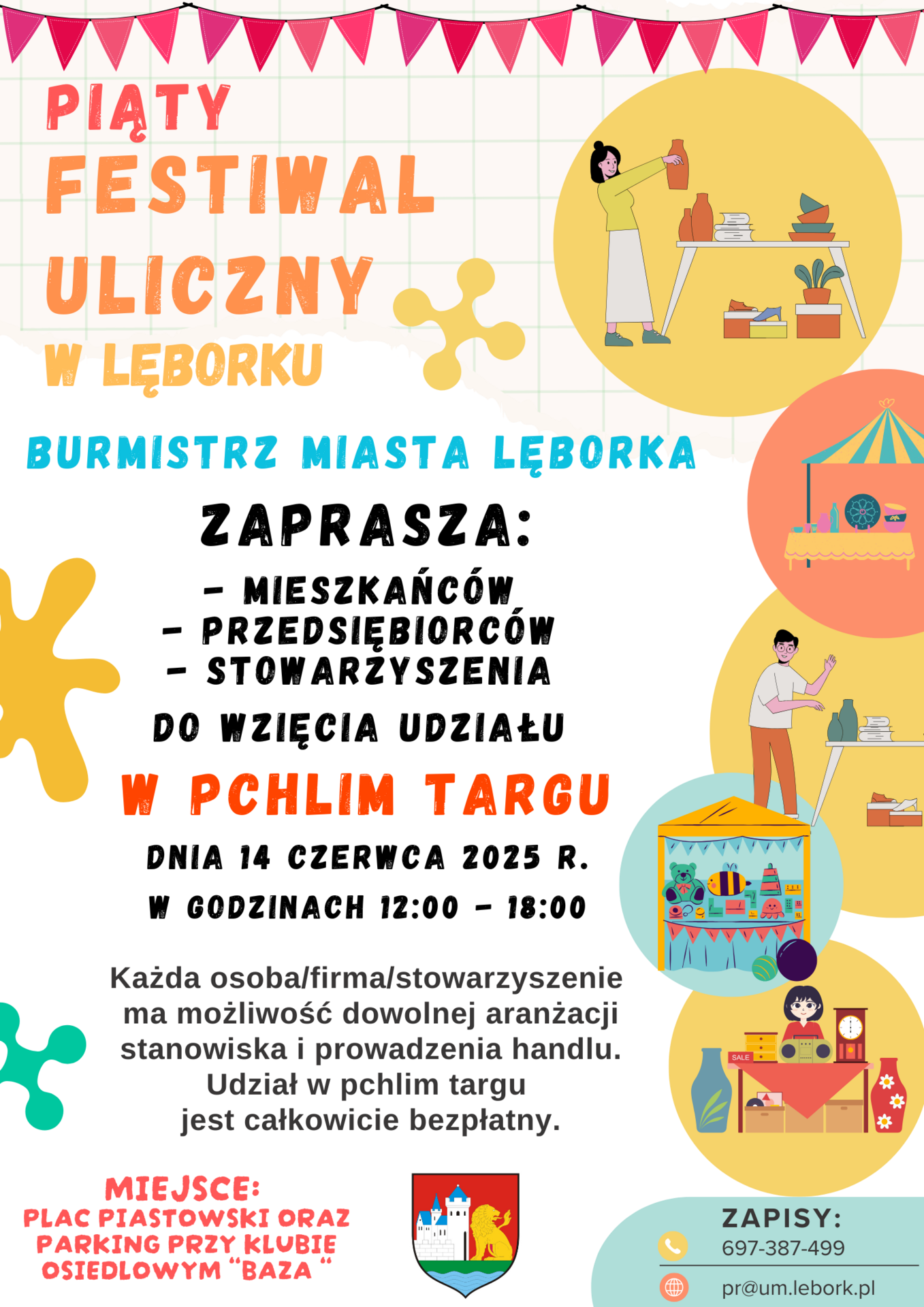 W ramach 5 edycji Festiwalu Ulicznego w Lęborku zapraszamy do wzięcia udziału w "Pchlim Targu", który odbędzie się 14 czerwca 2025 r., od godziny 12:00 do 18:00, na placu Piastowskim i na parkingu przy Klubie Osiedlowym „BAZA”.