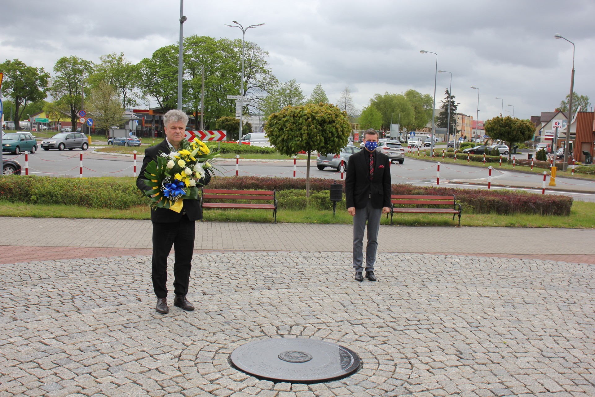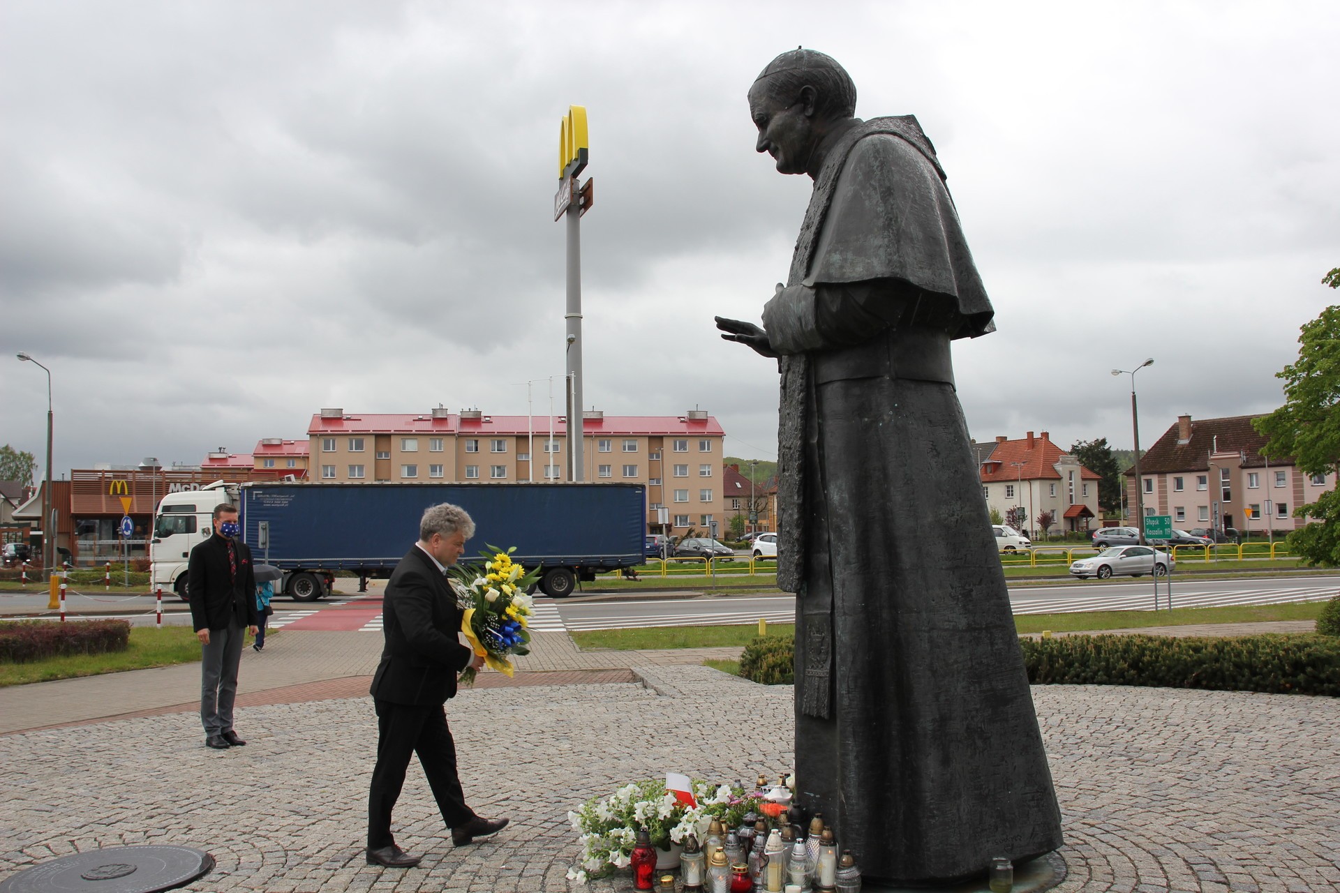 Burmistrz Lęborka Witold Namyślak wraz z Sekretarzem Miasta Marianem Kurzydło pod pomnikiem Papieża złożyli symboliczną wiązankę kwiatów.