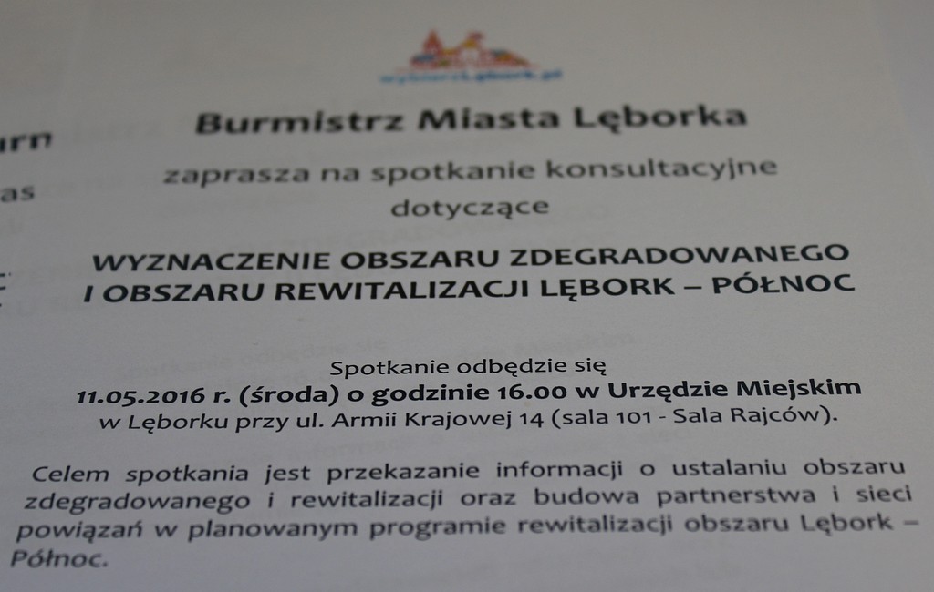 Burmistrz Miasta Lęborka zaprasza 11 maja 2016r. o godz. 16 na spotkanie konsultacyjne dotyczące wyznaczenia obszaru zdegradowanego i obszaru rewitalizacji Lębork – Północ. Spotkanie odbędzie się w Sali Rajców (pok. 101) Urzędu Miejskiego w Lęborku przy ul. Armii Krajowej.