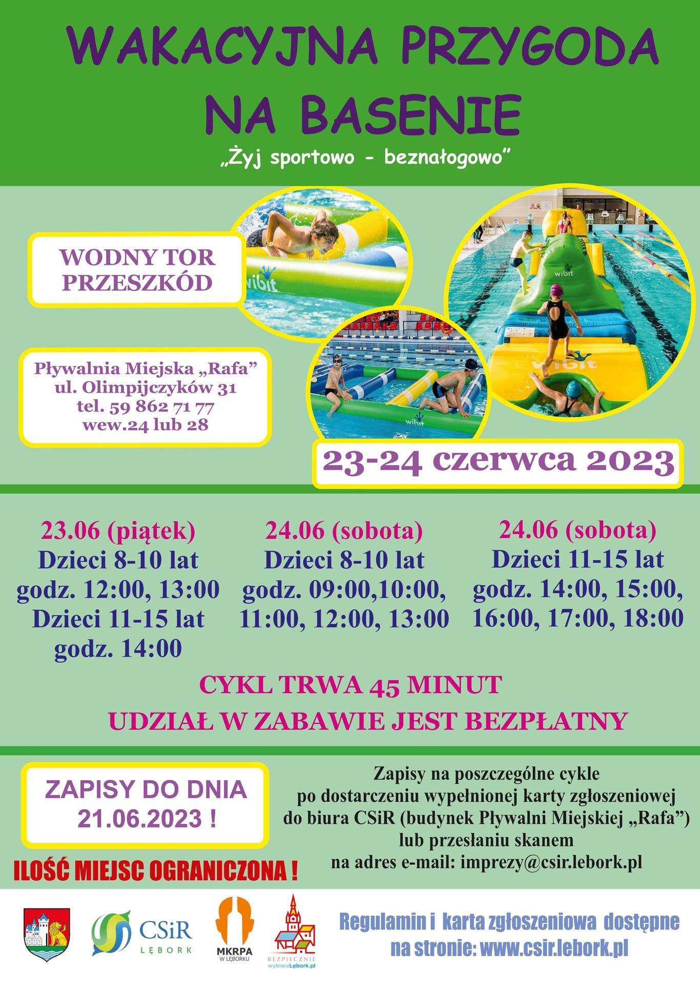 Burmistrz Miasta Lęborka, Centrum Sportu i Rekreacji oraz drużyna WOPR przy CSiR serdecznie zapraszają dzieci i młodzież do wspólnej zabawy na basenie. Zabawy na Wodnym Torze Przeszkód odbędą się 23 i 24 czerwca 2023 r. na Pływalni Miejskiej "Rafa" przy ul. Olimpijczyków 31 w Lęborku. Udział z zabawach dzieci jest nieodpłatny.