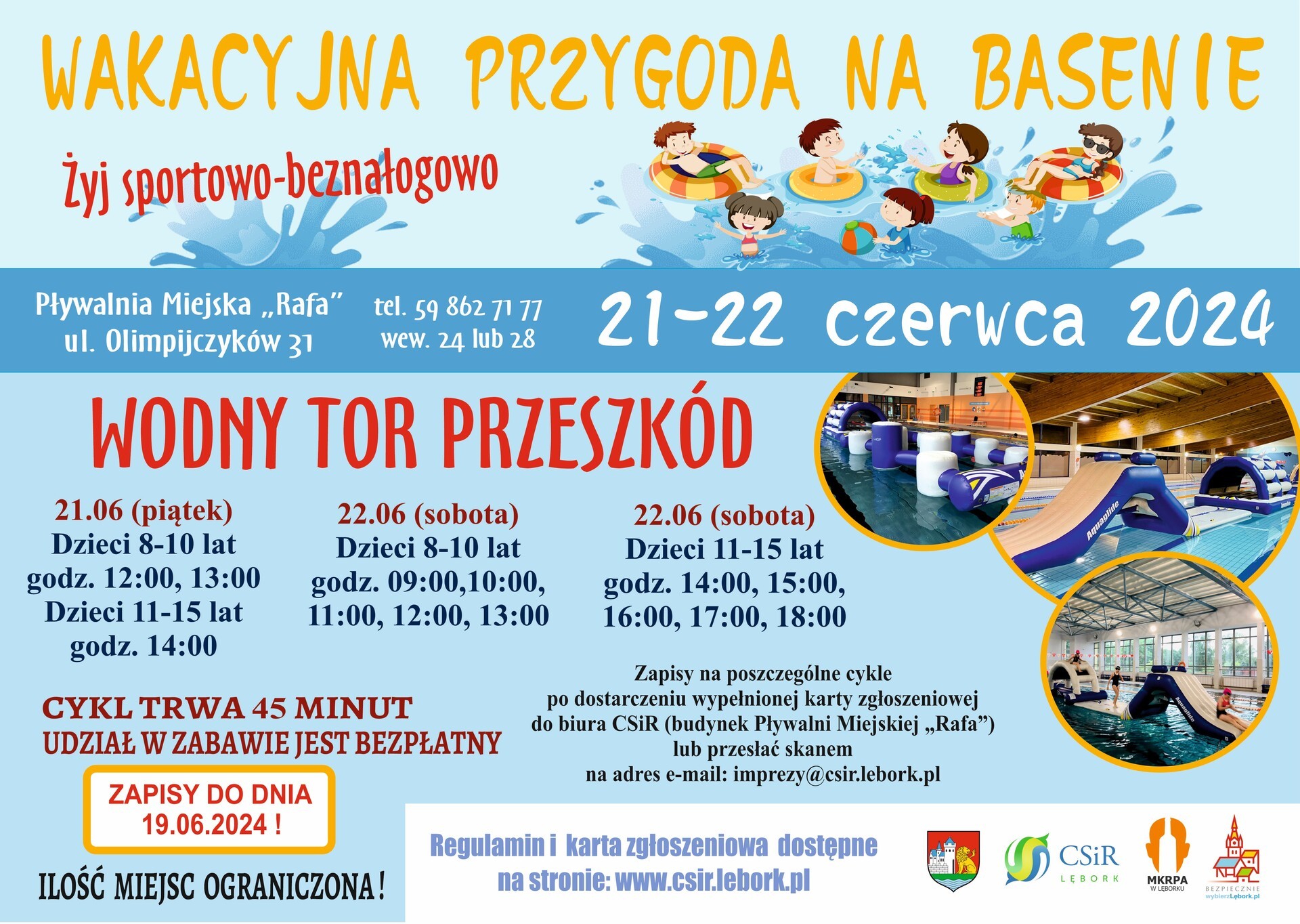 Burmistrz Miasta Lęborka, Centrum Sportu i Rekreacji oraz drużyna WOPR przy CSiR serdecznie zapraszają dzieci i młodzież do wspólnej zabawy na basenie. Zabawy na Wodnym Torze Przeszkód odbędą się 21 i 22 czerwca 2024 r. na Pływalni Miejskiej "Rafa" przy ul. Olimpijczyków 31 w Lęborku. Udział w zabawach dzieci jest nieodpłatny.