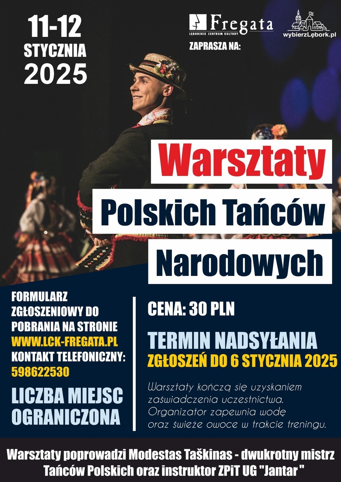 Lęborskie Centrum Kultury "Fregata" zaprasza na zajęcia pod nazwą "Podstawy tańca oraz wprowadzenie do tańca narodowego". Warsztaty odbędą się 11 i 12 stycznia 2025 roku w Stacji Kultura przy ul. Dworcowej 8a (budynek PKP). Nowy cykl zajęć w Lęborskim Centrum Kultury ”Fregata” poprowadzi Modestas Taškinas - tegoroczny mistrz Tańców Polskich, tancerz i instruktor w Zespole Pieśni i Tańca Uniwersytetu Gdańskiego "Jantar".