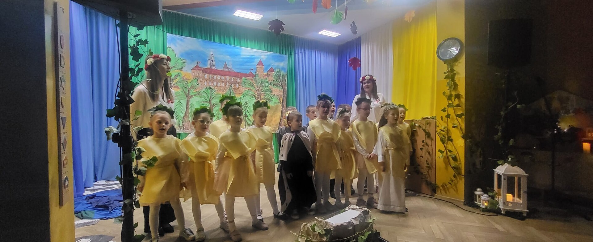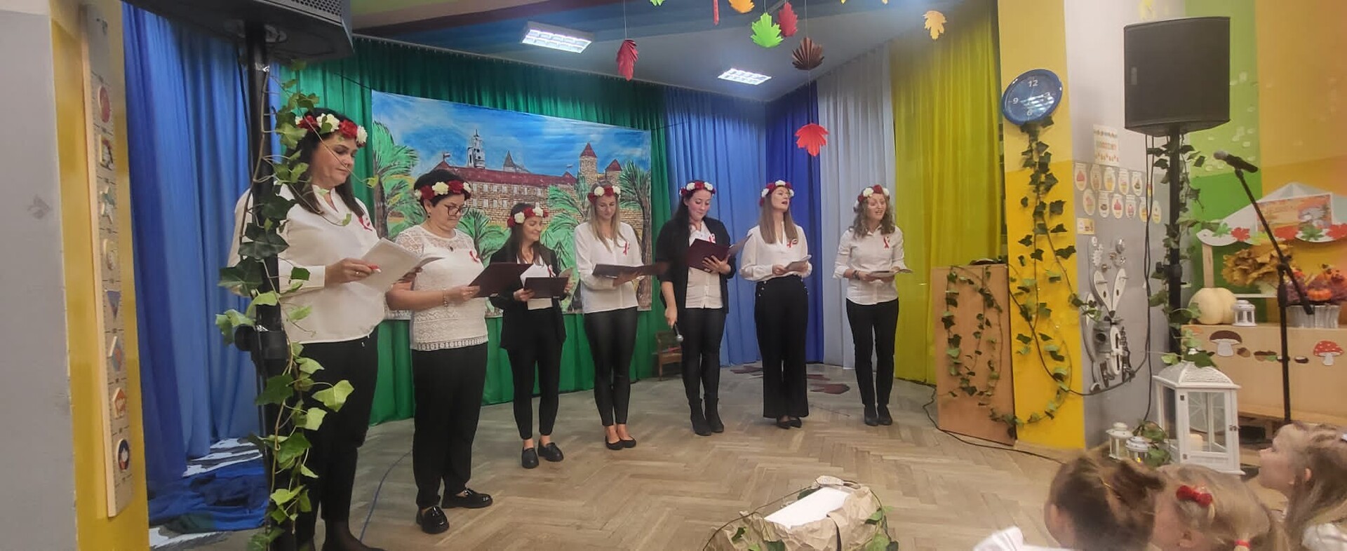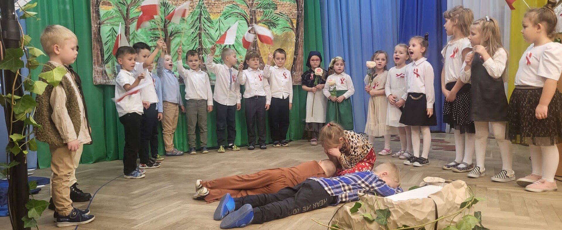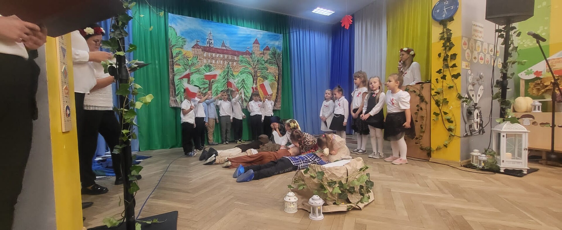 Wieczornicę rozpoczęły występy najmłodszych uczestników. Dzieci, ubrane w barwy narodowe, prezentowały swoje umiejętności artystyczne, pełne radości i entuzjazmu. Następnie głos zabrali nauczyciele i pracownicy przedszkola, którzy zaprezentowali nie tylko swoje muzyczne talenty, ale także zaangażowanie w edukację patriotyczną najmłodszych. Wspólny śpiew nauczycieli i personelu przedszkola wypełnił salę radosnym dźwiękiem.