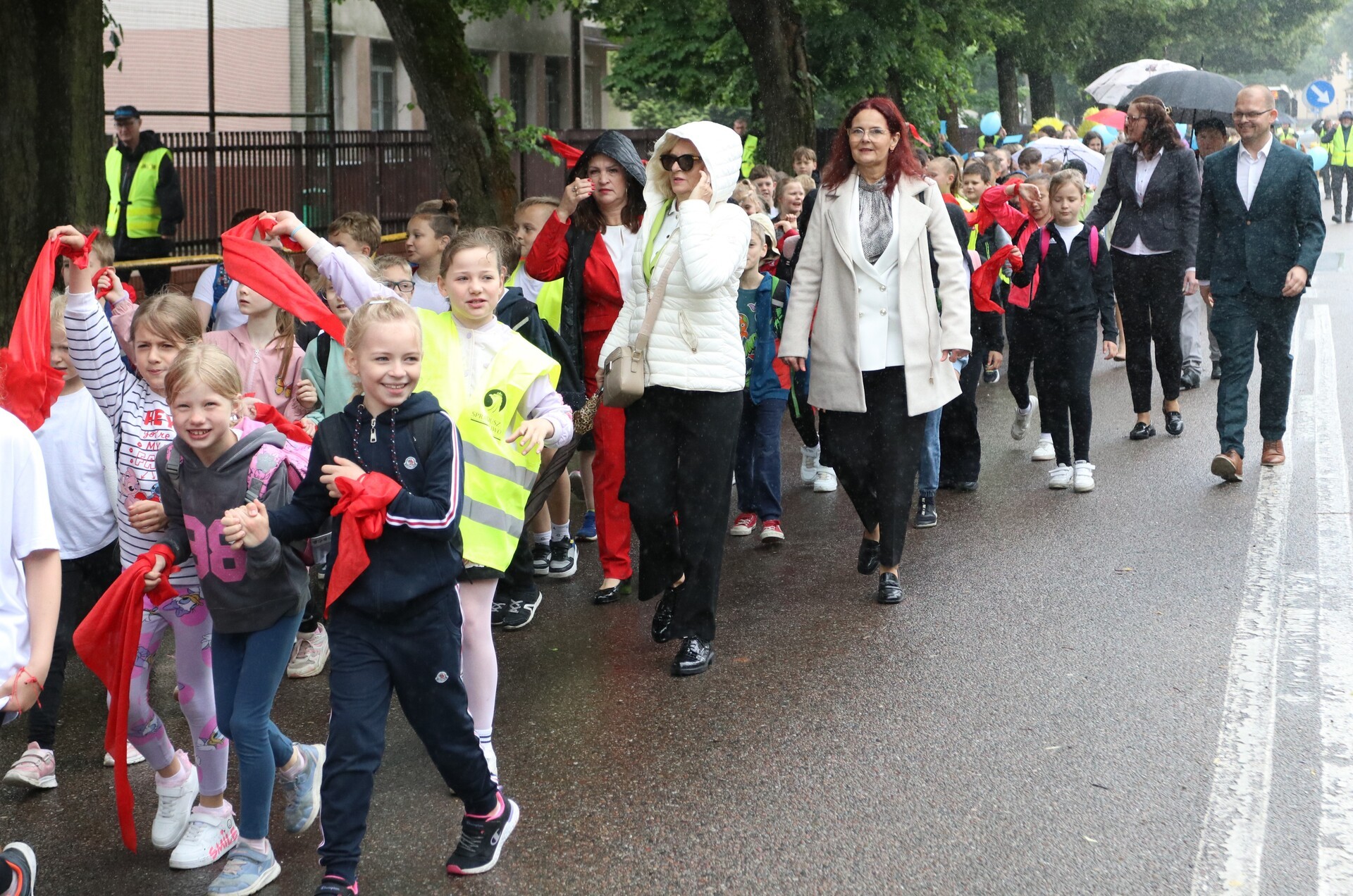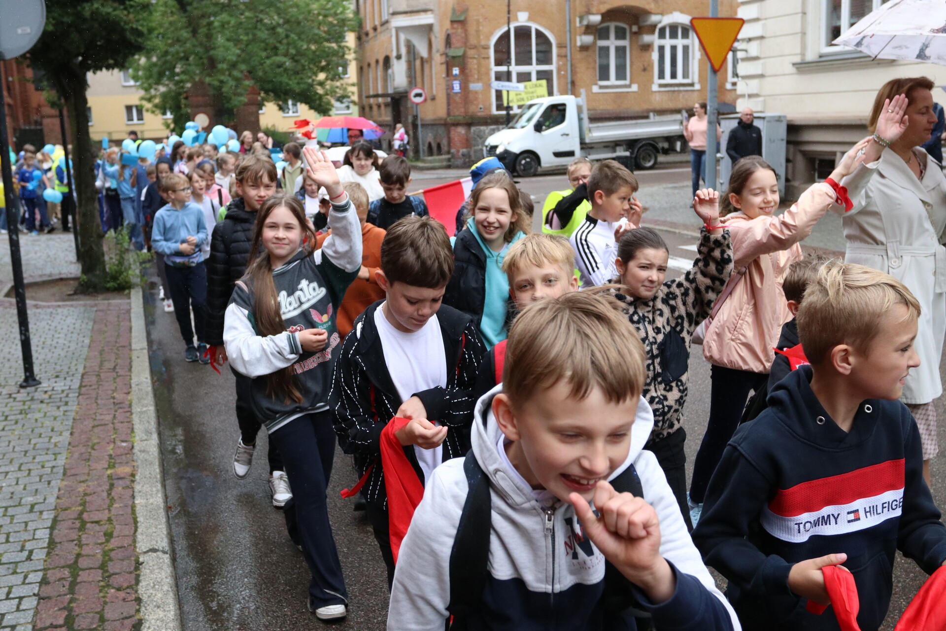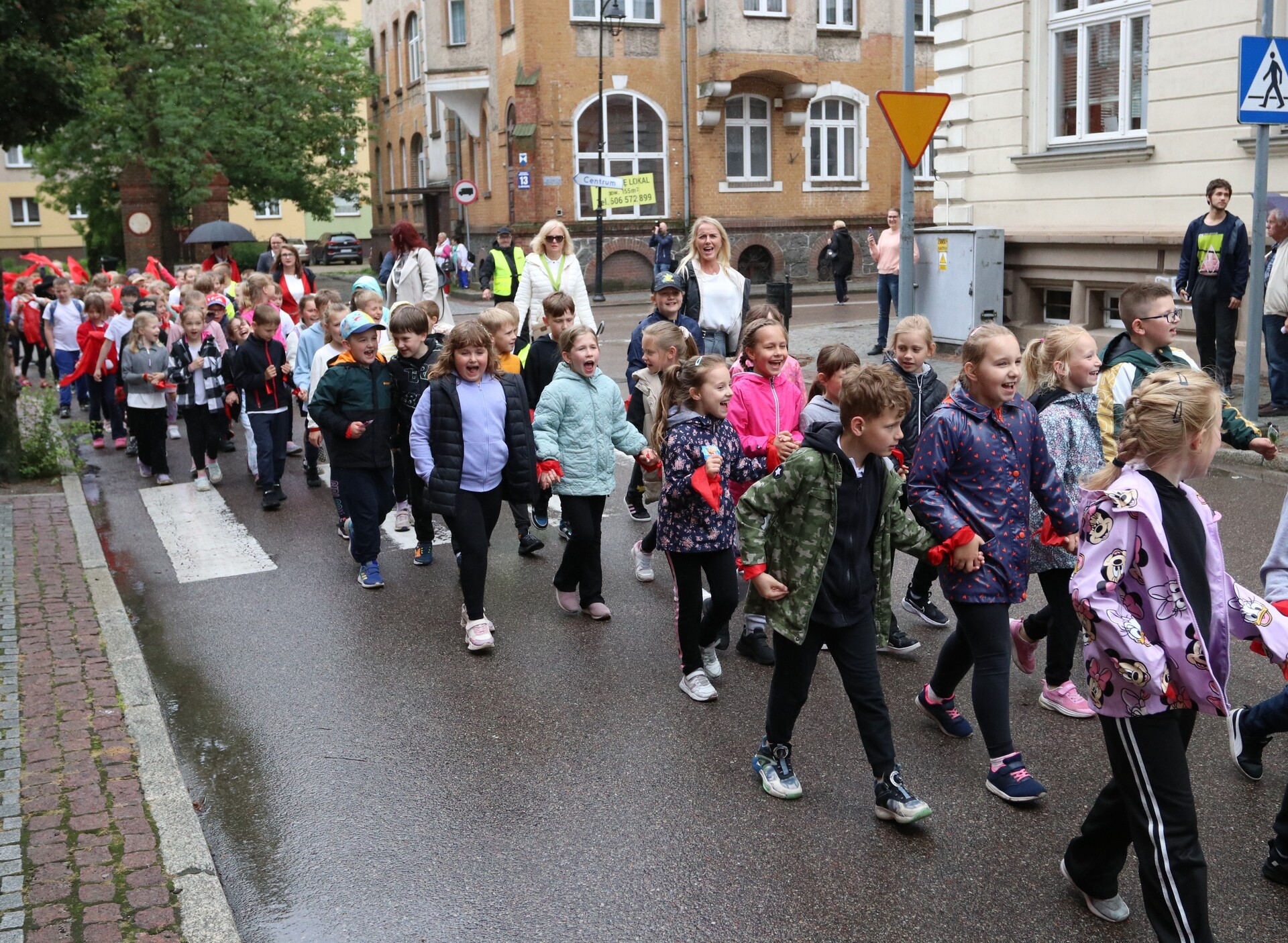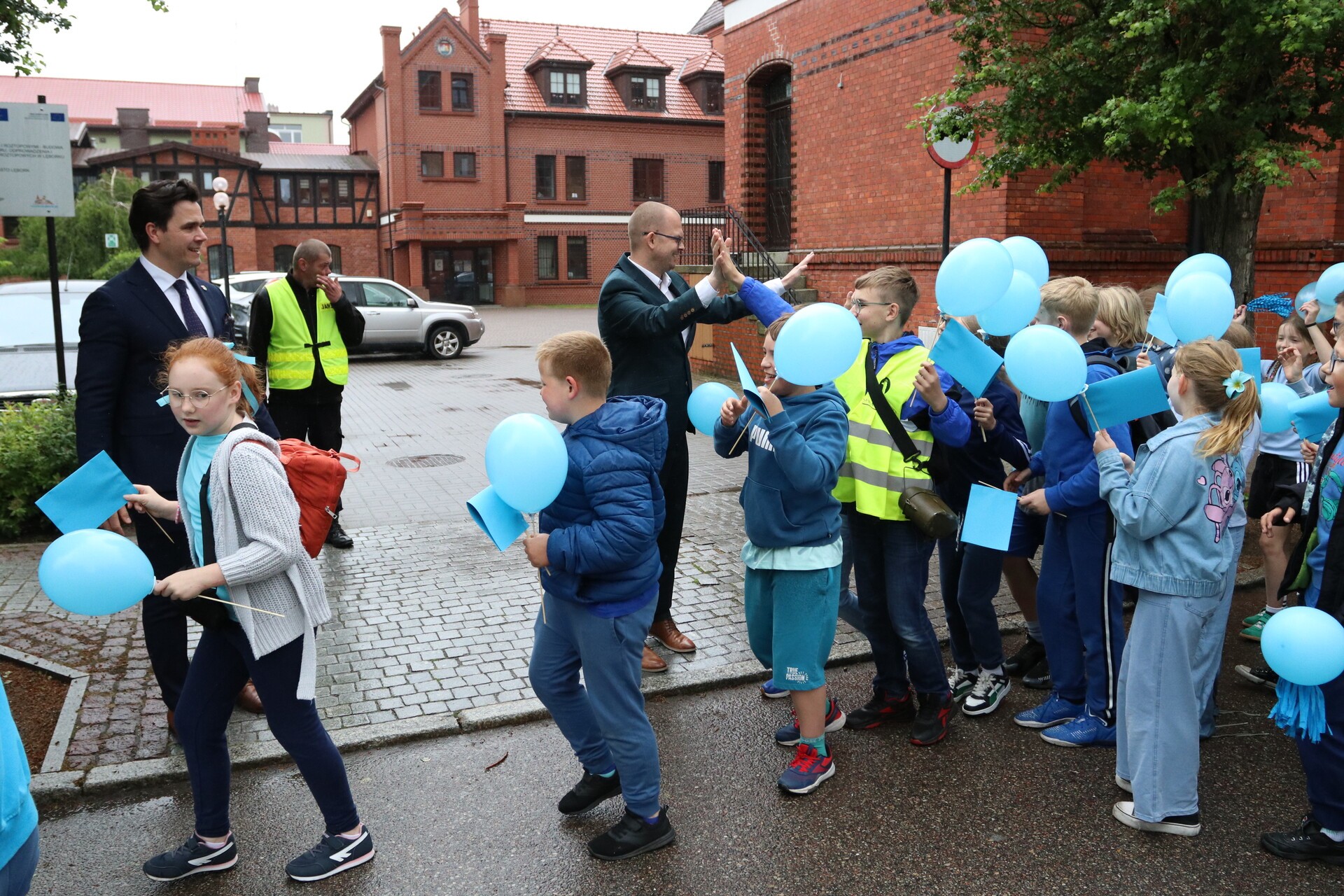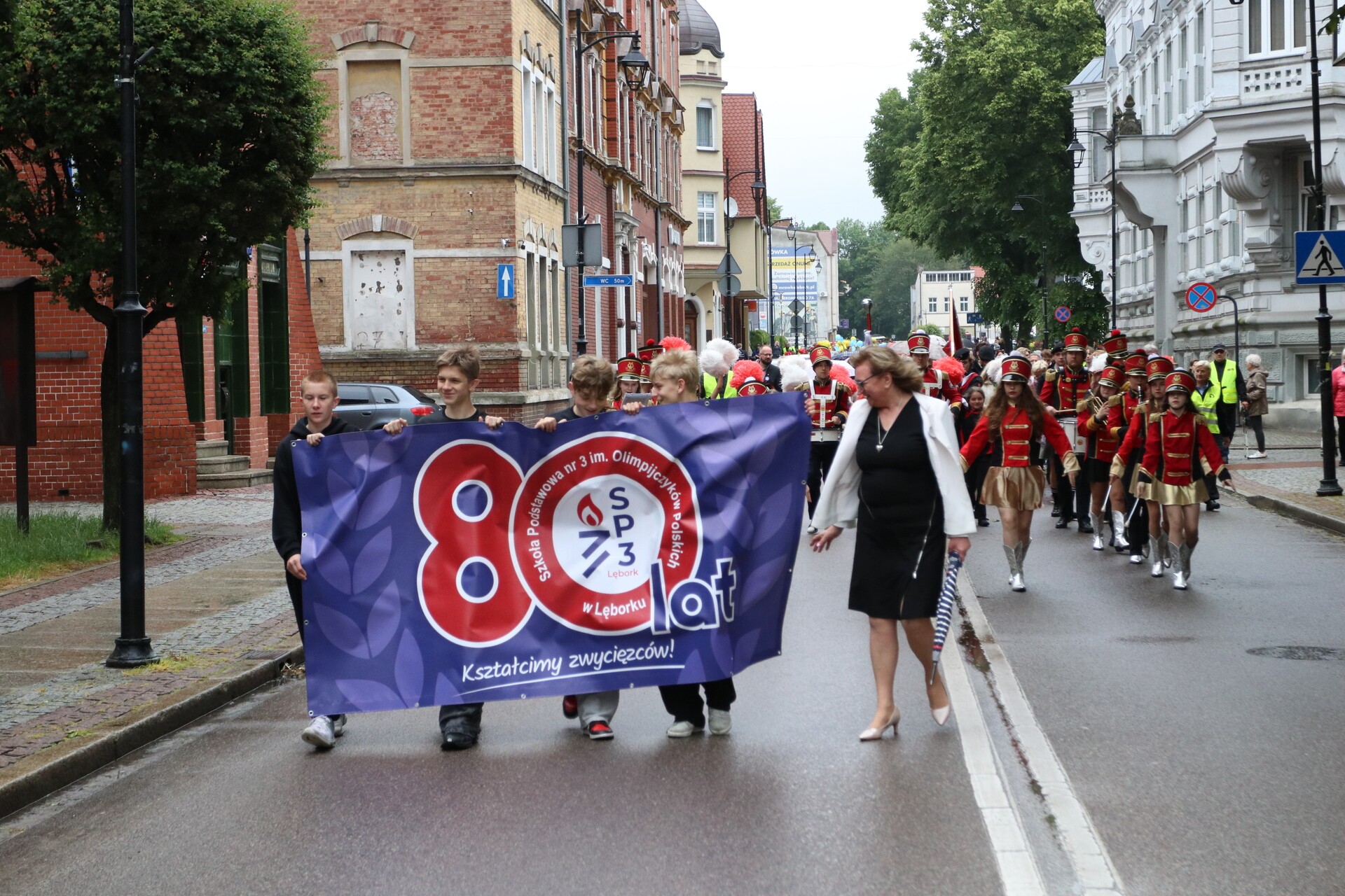 Jubileuszowe obchody rozpoczął barwny i głośny, mimo deszczowej aury, przemarsz uczniów, nauczycieli, rodziców oraz zaproszonych gości ulicami centrum Lęborka. Przy ratuszu do świętujących dołączyli burmistrz miasta Jarosław Litwin, zastępca burmistrza Krzysztof Król i przewodniczący Rady Miejskiej Radosław Zimnowoda. Kolorowe transparenty i dźwięki Orkiestry Dętej „Ziemia Lęborska” przyciągnęły uwagę przechodniów, tworząc niezwykłą atmosferę radości i wspólnoty.