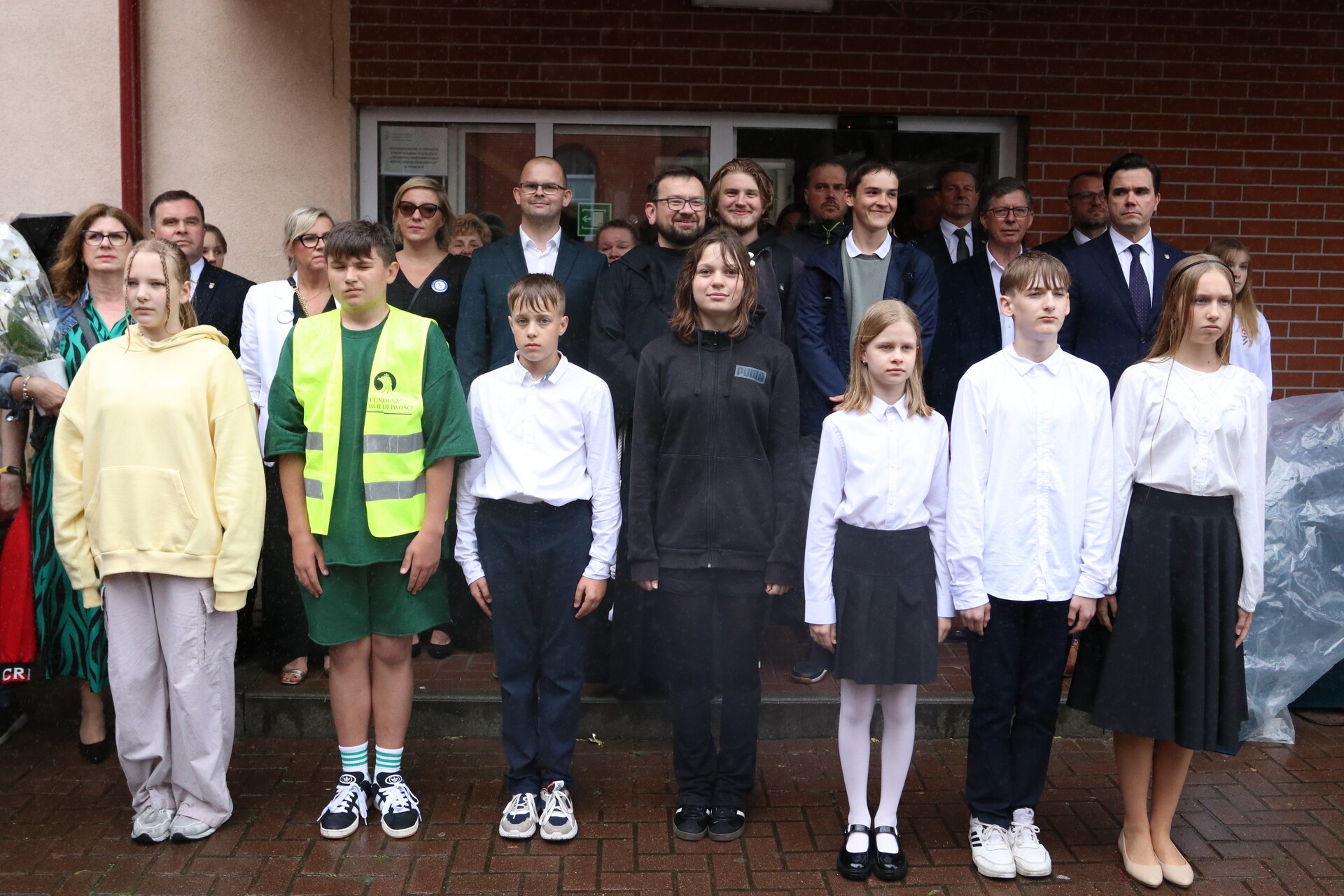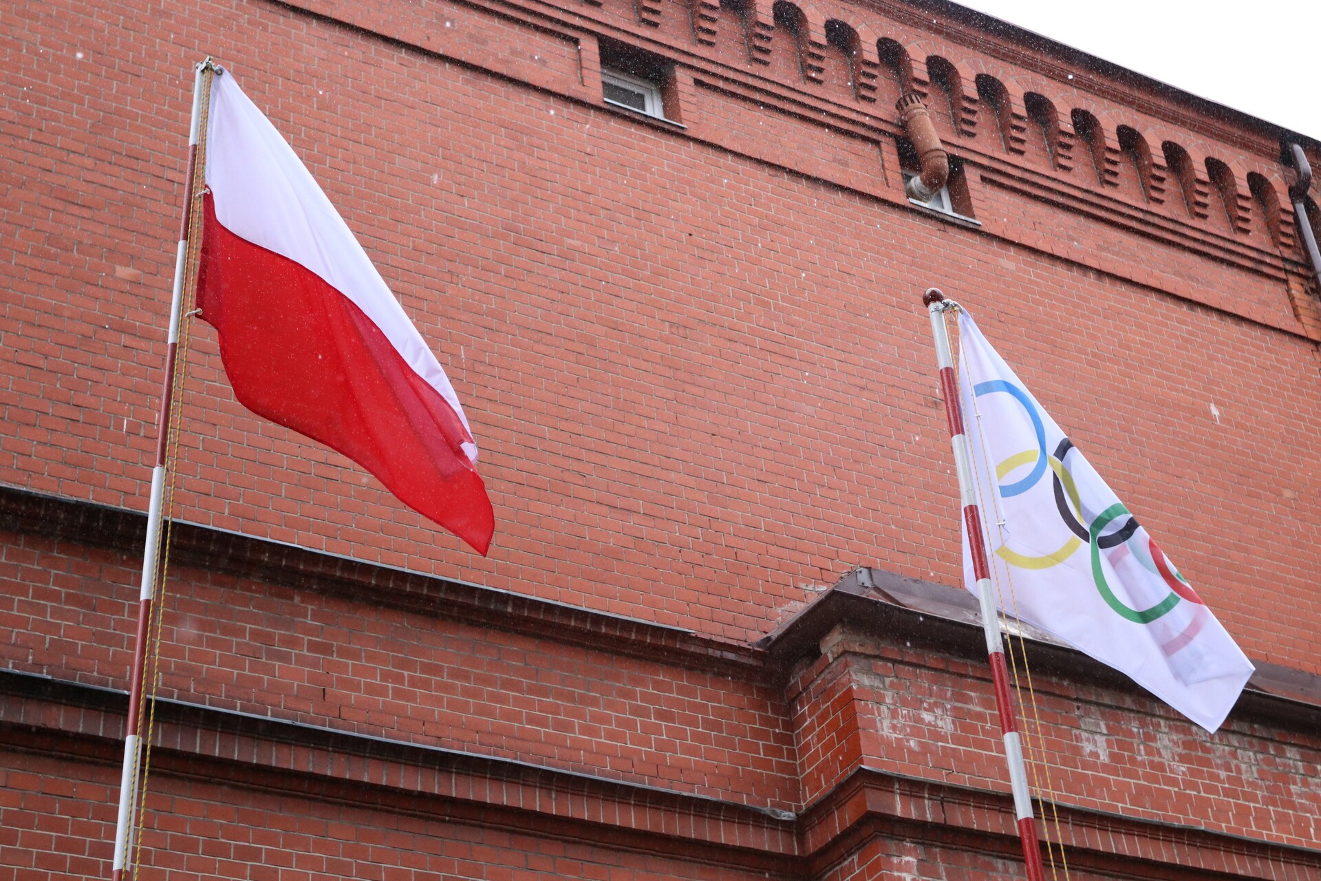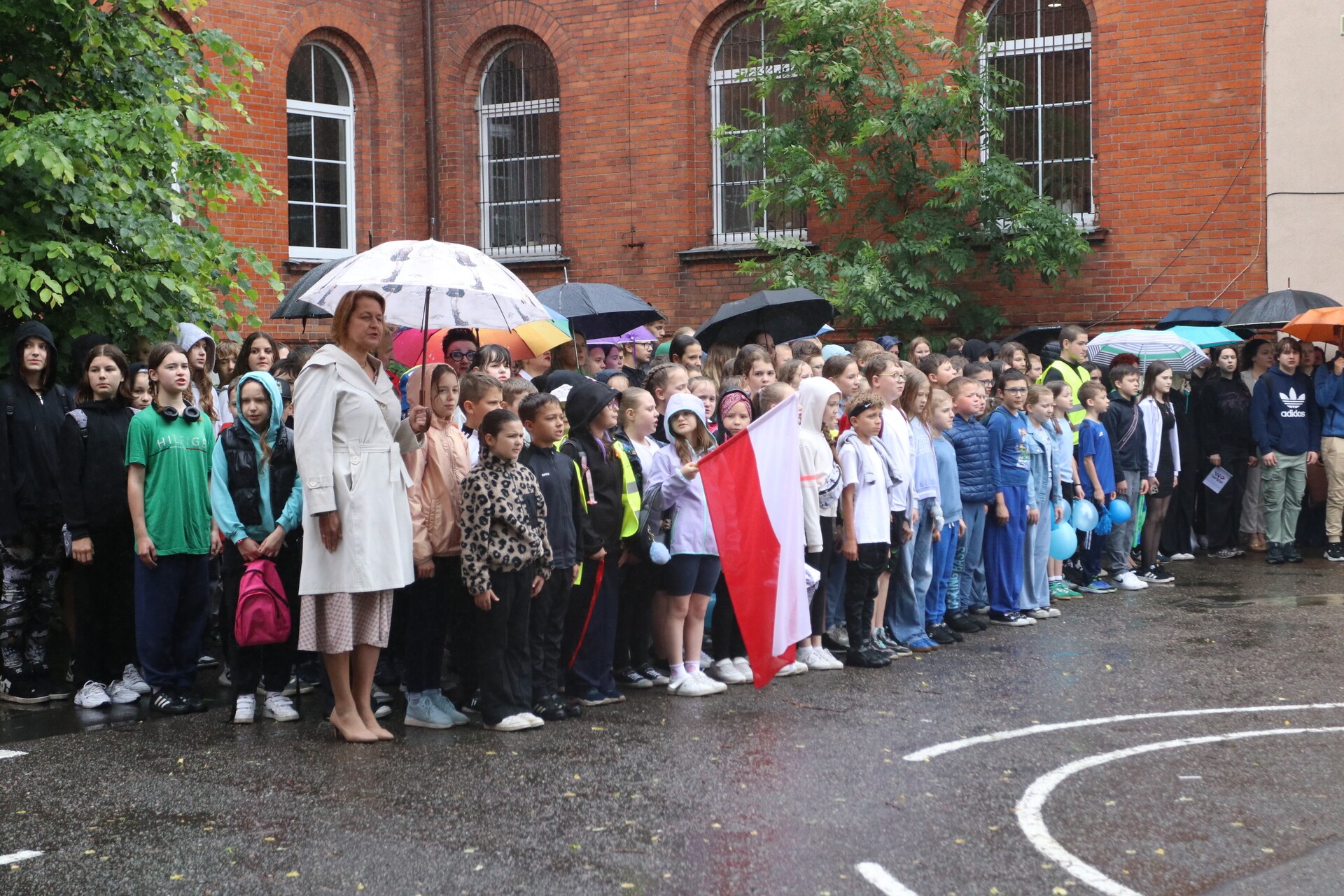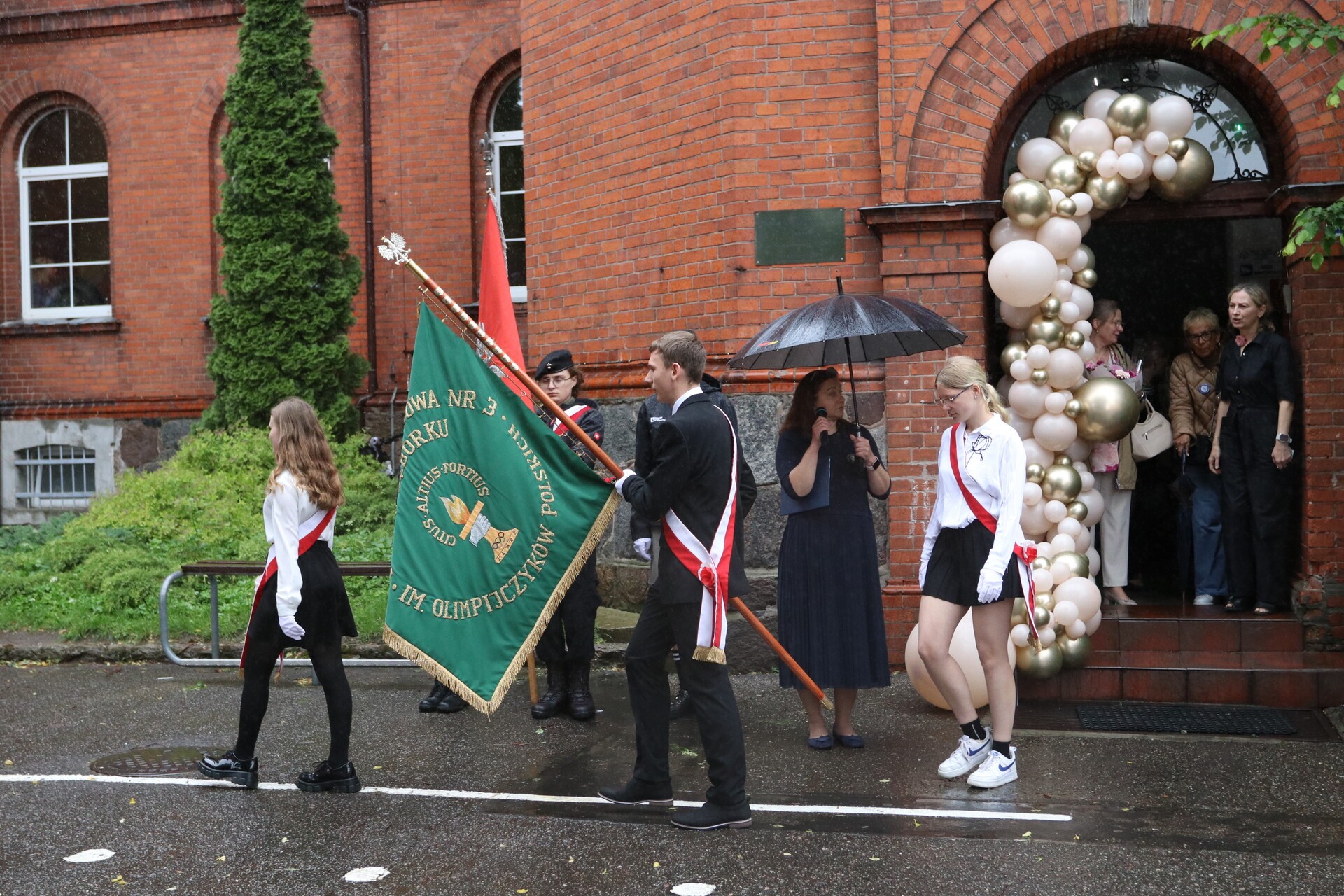 Oficjalna część uroczystości rozpoczęła się na dziedzińcu szkoły od wprowadzenia sztandaru, wciągnięciu na maszty flag Polski i olimpijskiej oraz odśpiewaniu hymnu narodowego i wysłuchaniu hymnu olimpijskiego.