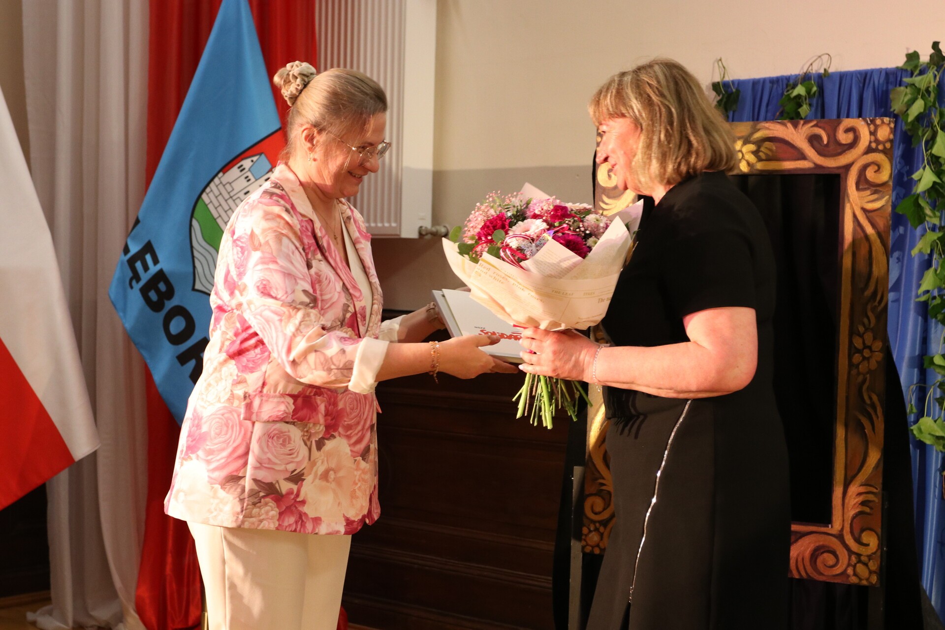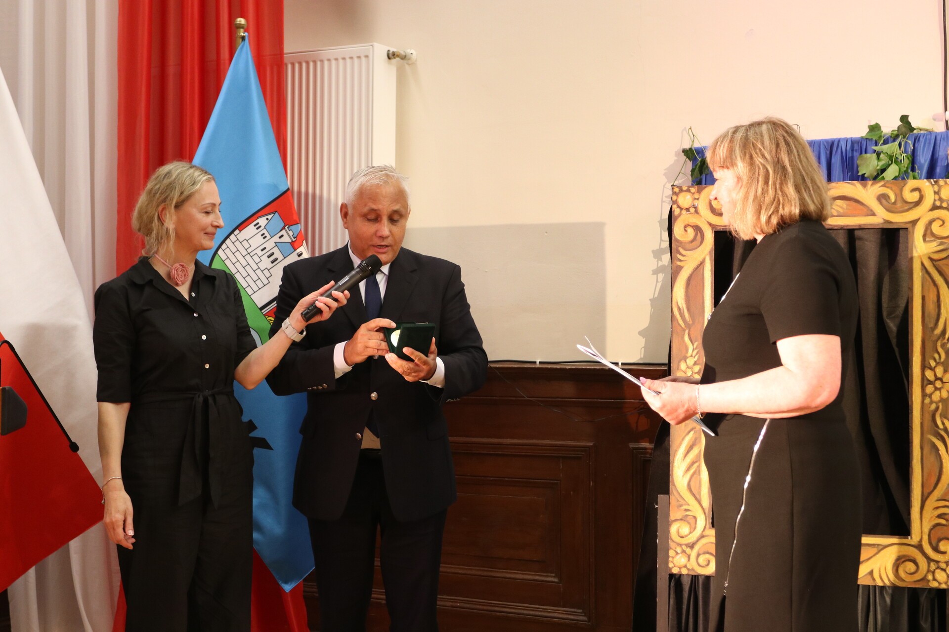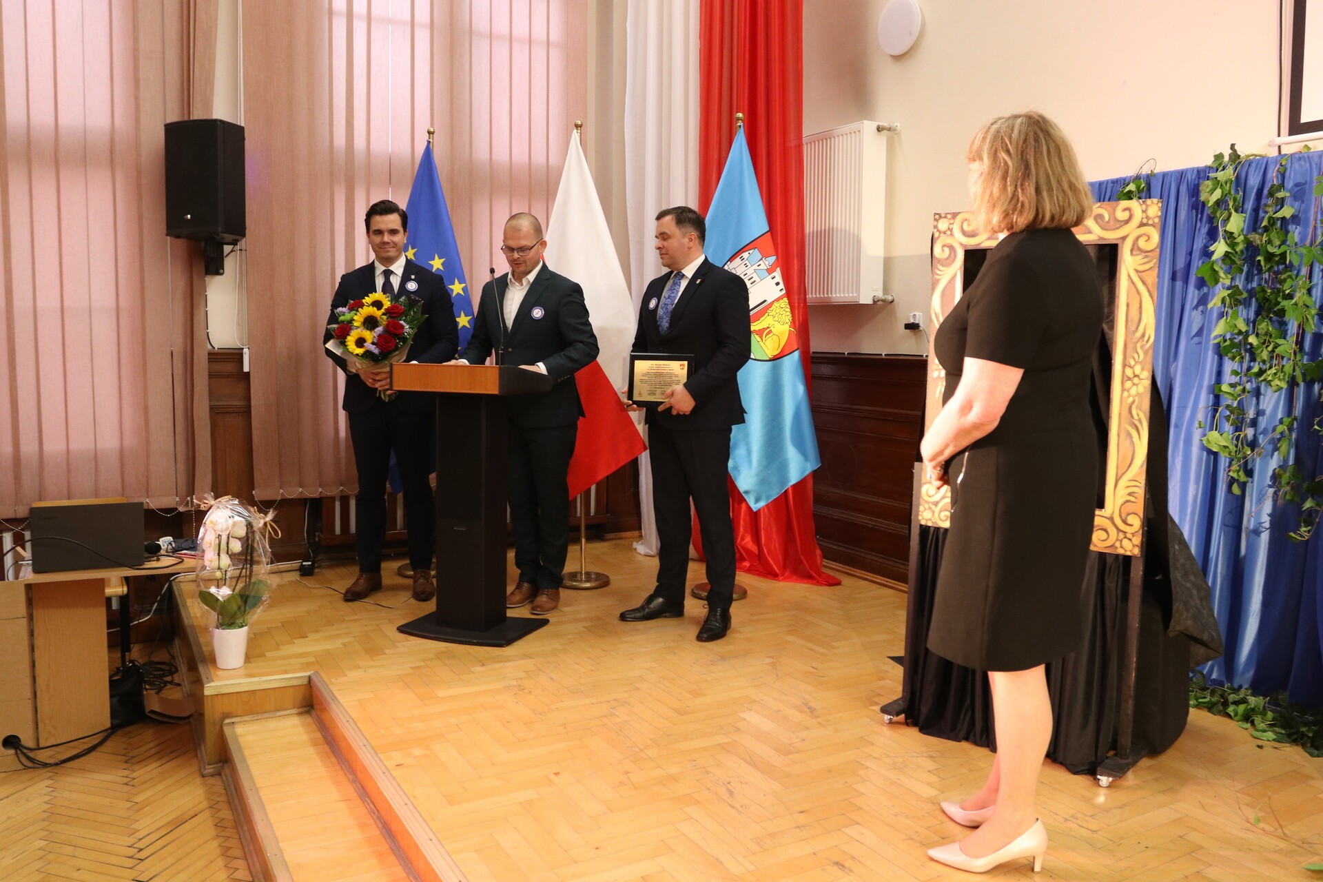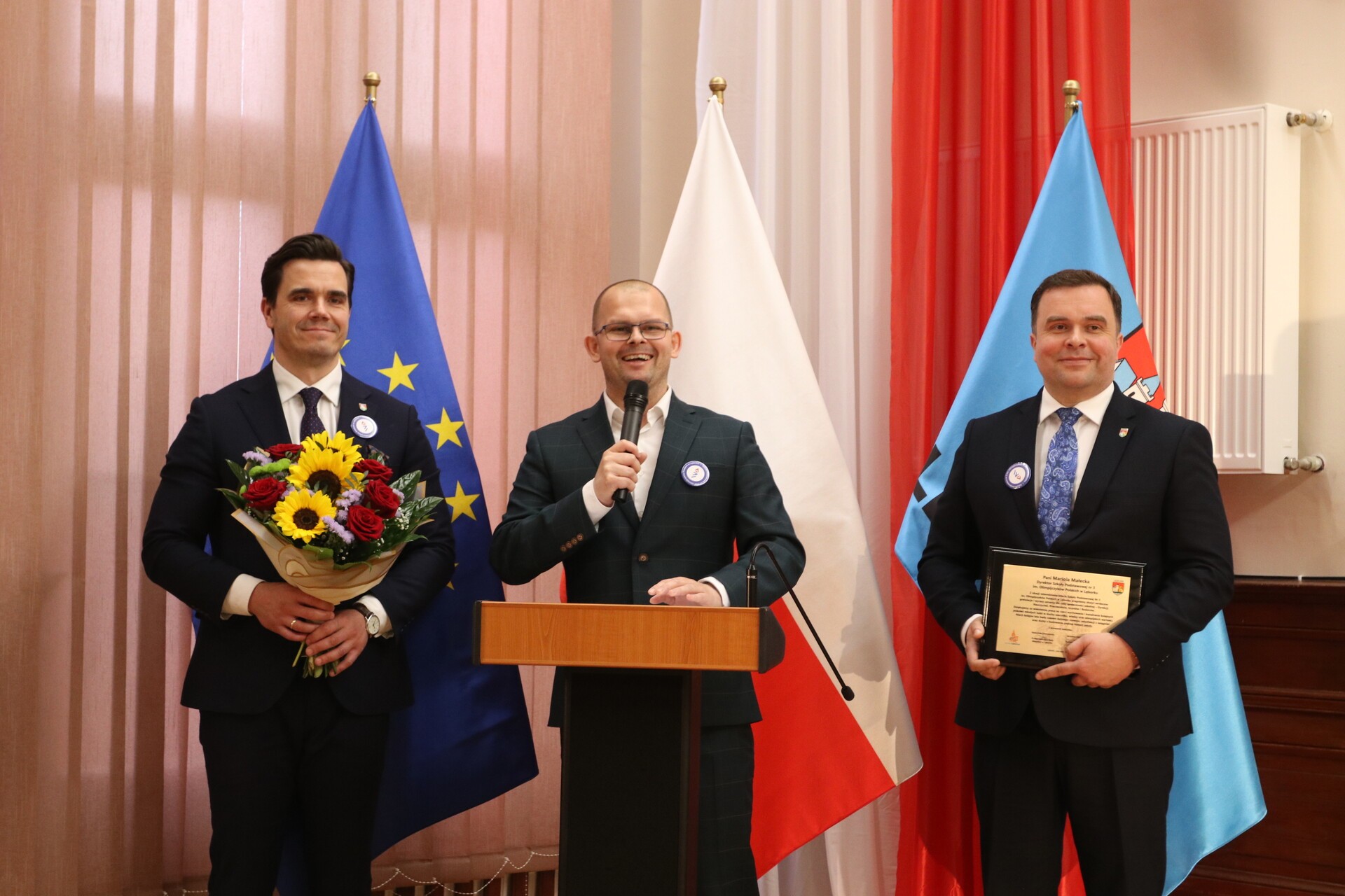 Jako pierwszy gratulacje i życzenia, wraz z jubileuszowym grawertonem, przekazał burmistrz miasta Jarosław Litwin, któremu towarzyszyli zastępca burmistrza Krzysztof Król oraz przewodniczący Rady Miejskiej Radosław Zimnowoda.