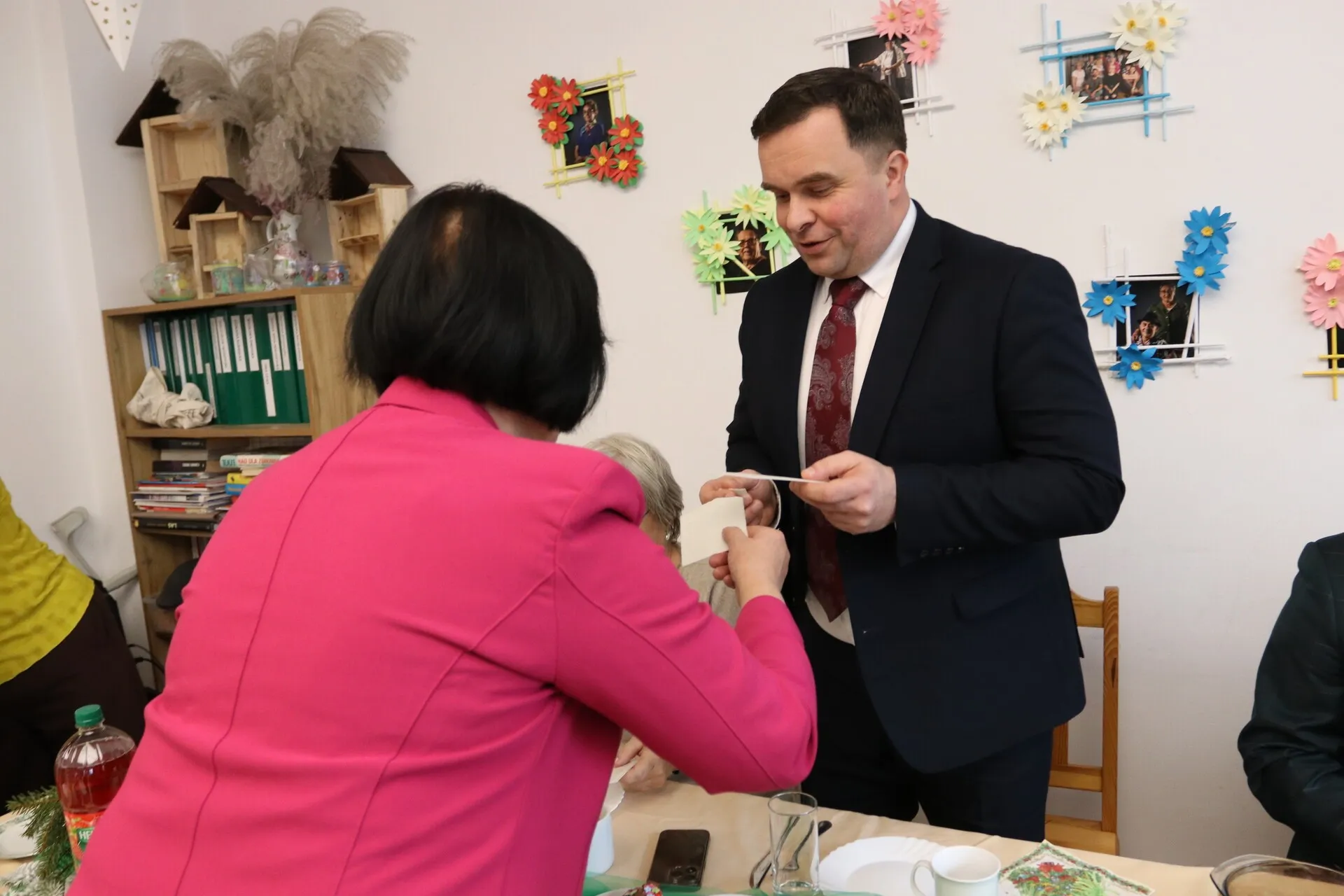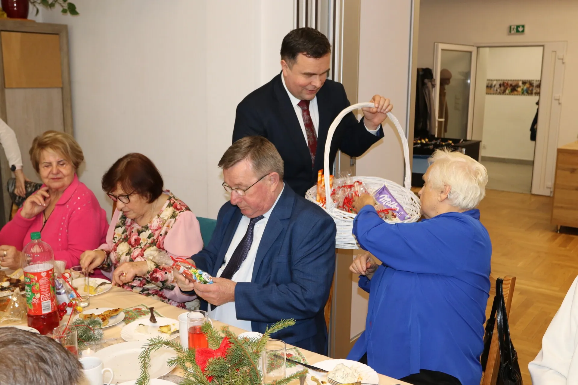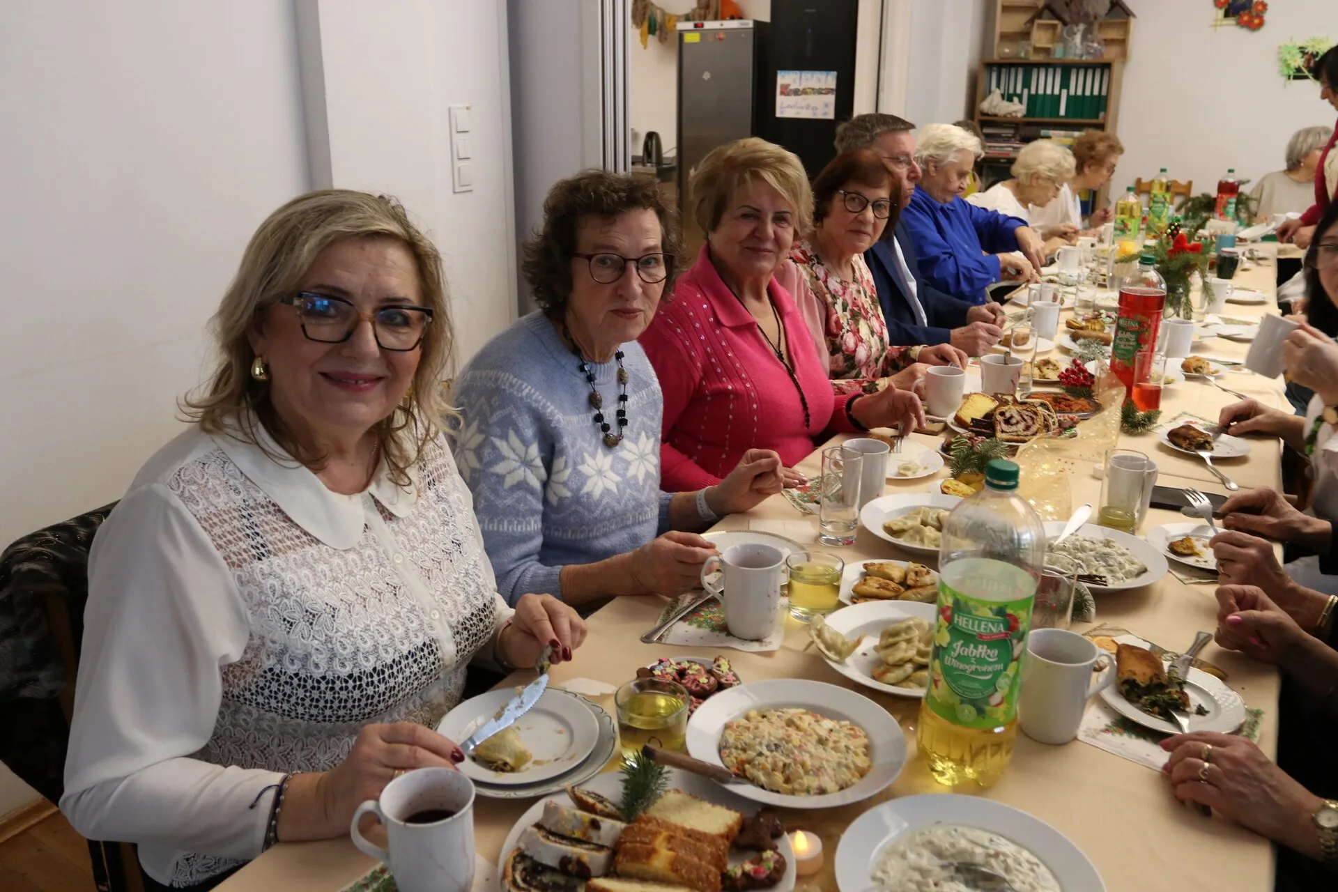 Seniorzy zadbali o przygotowanie wigilijnych potraw, którymi zastawione były pięknie ustrojone stoły. Spotkanie upłynęło w ciepłej, świątecznej atmosferze, podkreślając znaczenie więzi i wspólnoty wśród osób starszych. Gościom z ratusza seniorzy, których pasją jest malowanie, podarowali obrazy.