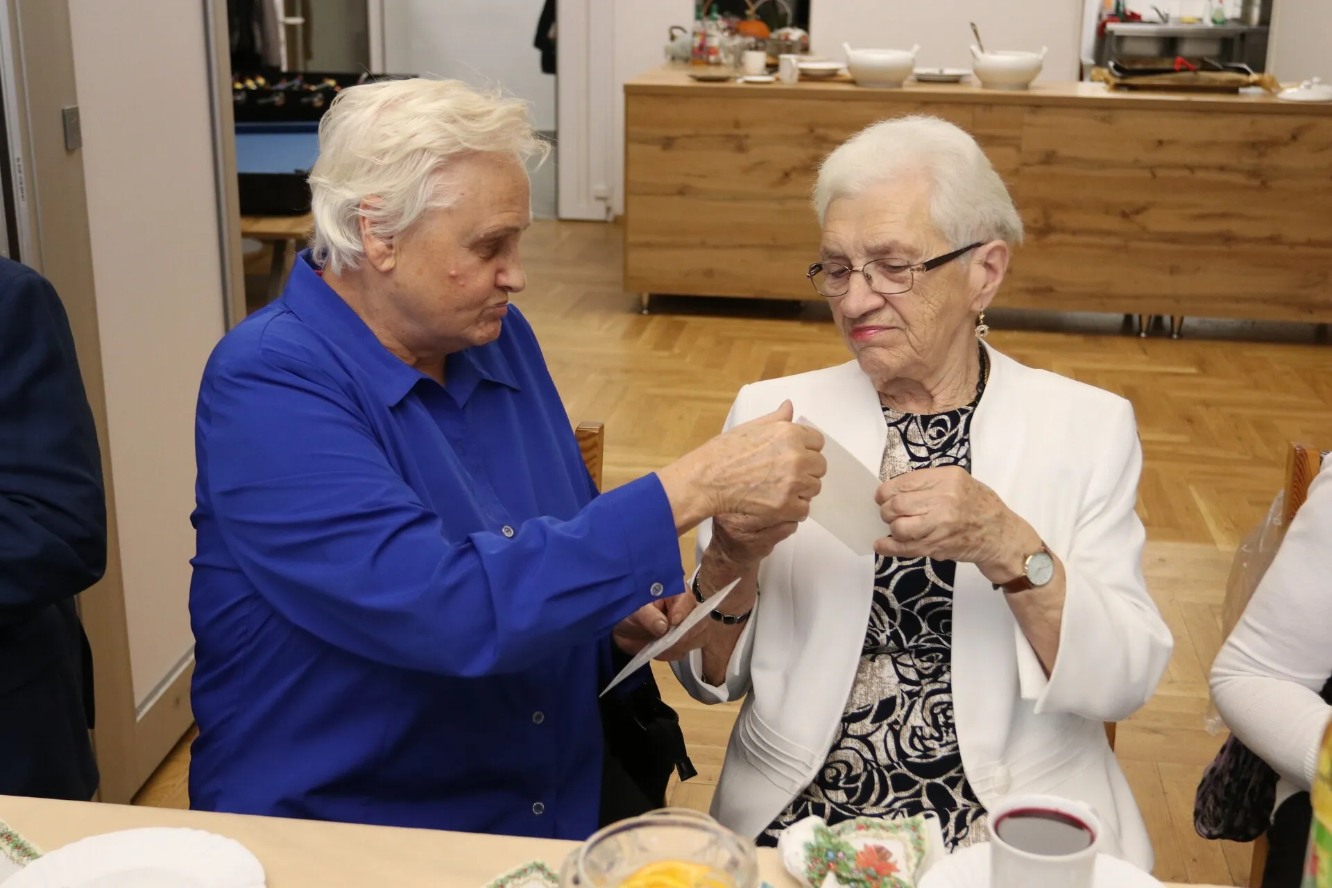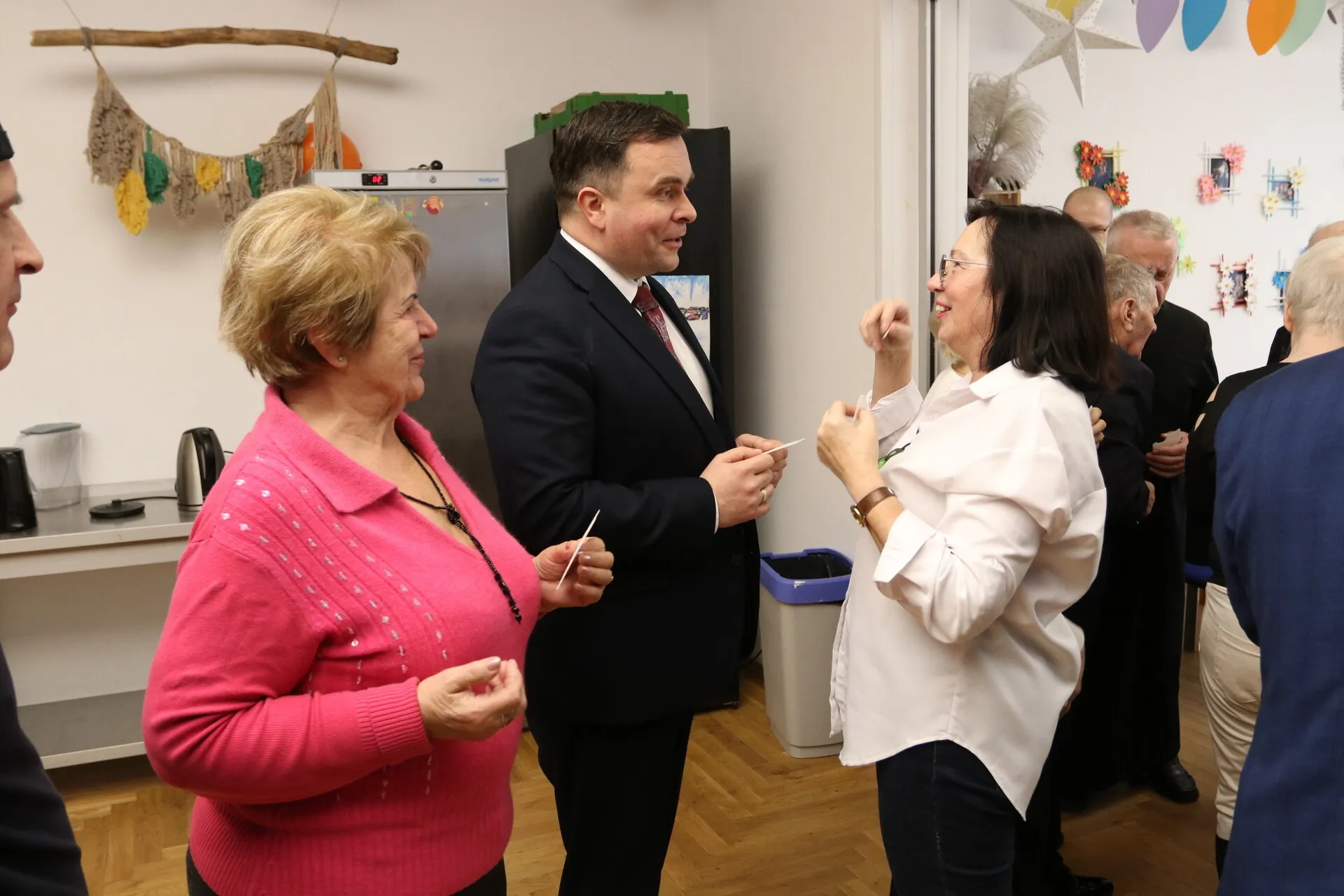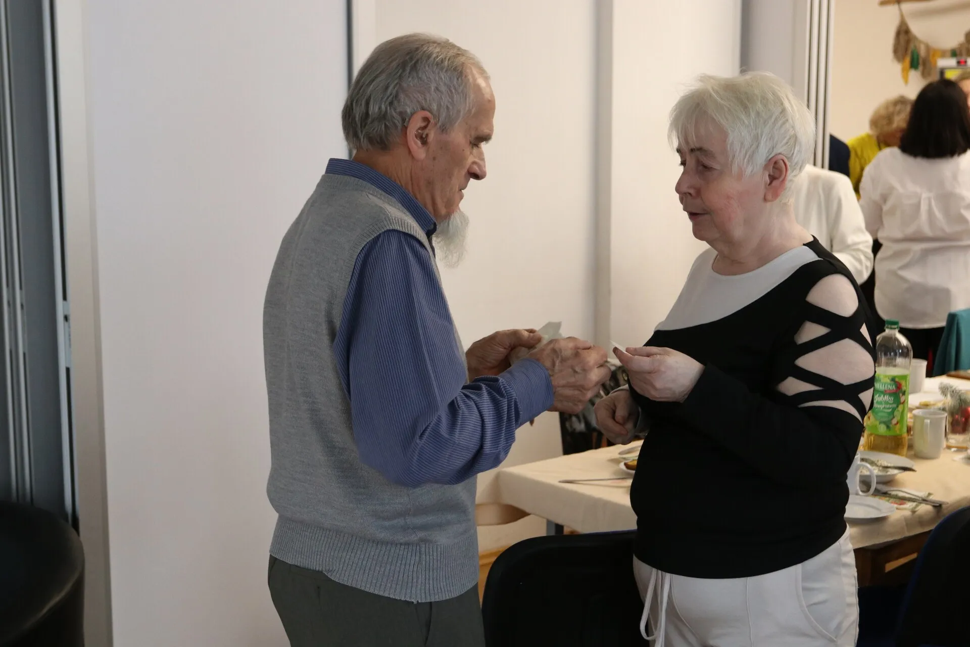 Seniorzy zadbali o przygotowanie wigilijnych potraw, którymi zastawione były pięknie ustrojone stoły. Spotkanie upłynęło w ciepłej, świątecznej atmosferze, podkreślając znaczenie więzi i wspólnoty wśród osób starszych. Gościom z ratusza seniorzy, których pasją jest malowanie, podarowali obrazy.