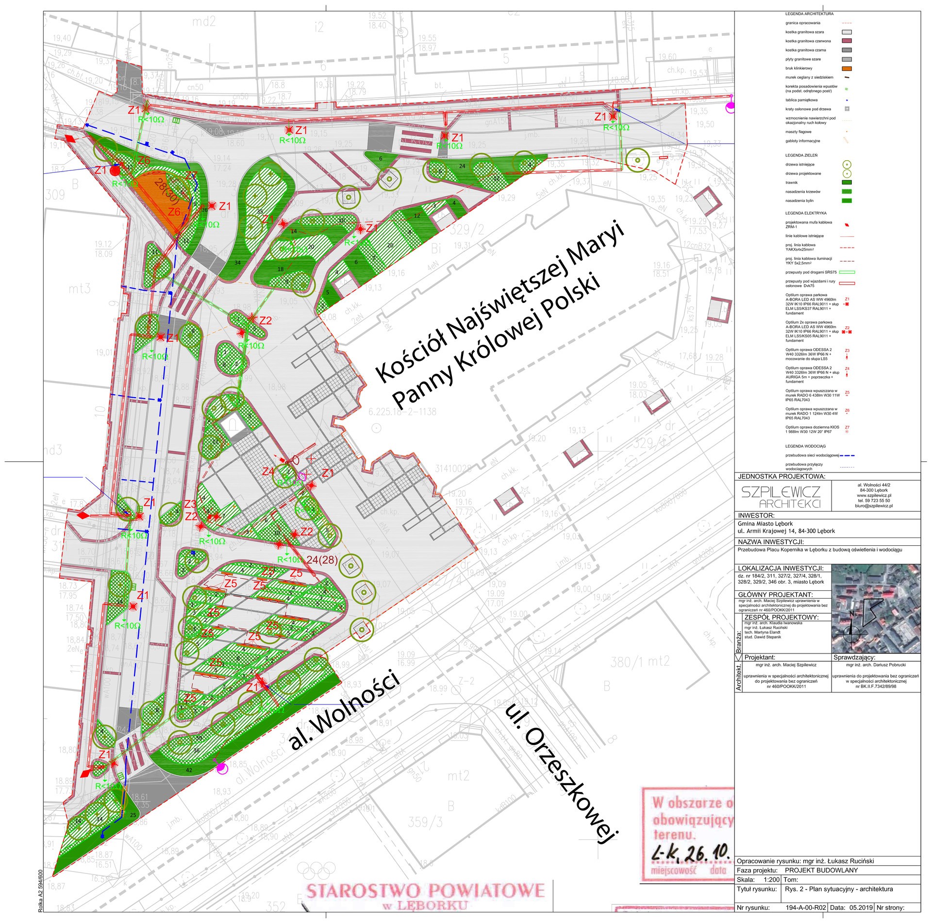 Z racji na reprezentacyjny charakter projektowanej przestrzeni publicznej projekt zakłada wykorzystanie szlachetnych nawierzchni z kostki granitowej. Nawierzchnie piesze przewidziano w zdecydowanej większości z kostki granitowej ciętej oraz kostki granitowej czerwonej łupanej. Ponadto projekt przewiduje wprowadzenie elementów z pojedynczej grafitowej kostki łupanej podkreślającej kompozycję placu. Nawierzchnie jezdni i parkingów wyłożone zostaną szarą łupaną kostką granitową.
