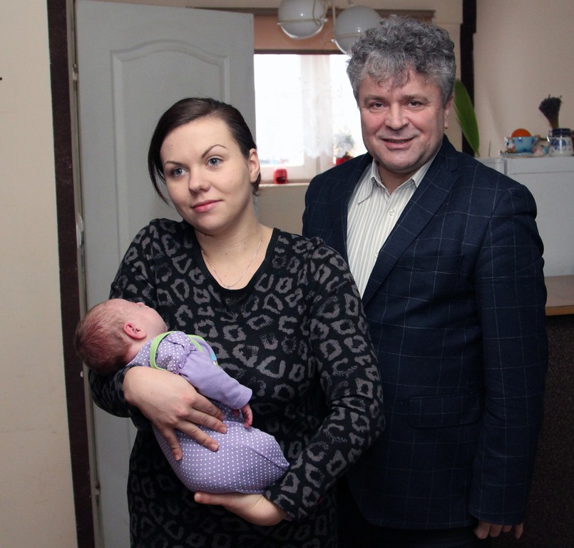 Burmistrz Lęborka Witold Namyślak odwiedził pierwsze urodzone w 2016 roku w Lęborku dziecko, małą Amelię i jej rodziców, pp. Julię i Roberta Oleszek.