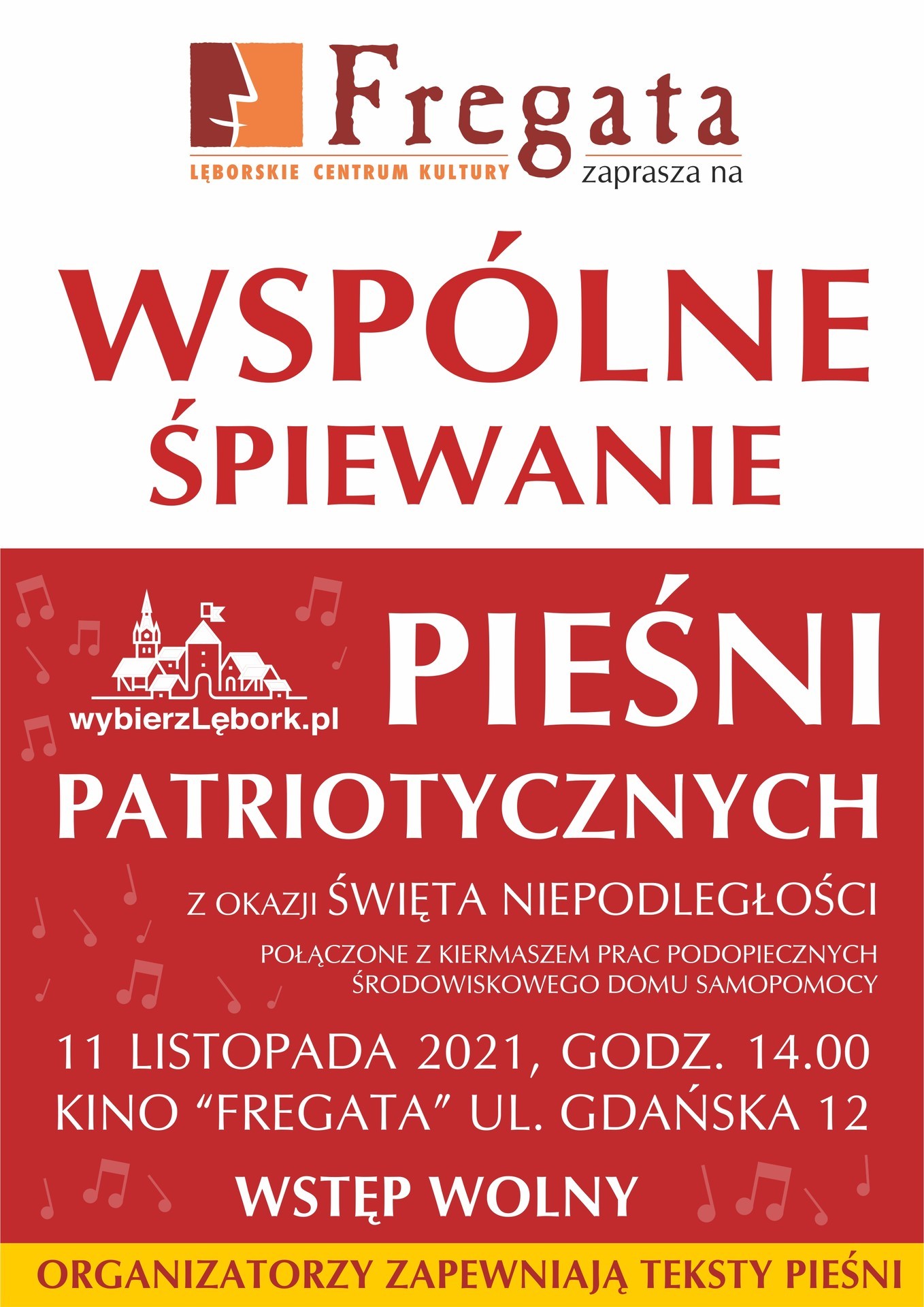Lęborskie Centrum Kultury „Fregata” zaprasza na jedenaste lęborskie Wspólne Śpiewanie Pieśni Patriotycznych z okazji Święta Niepodległości. Impreza jest jedną z nielicznych okazji do wspólnego przypomnienia sobie starych polskich piosenek i pieśni patriotycznych.