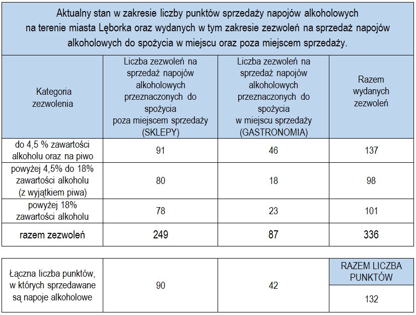 Podkreślić należy, że w świetle dotychczas obowiązujących przepisów rady gmin ustalały limit punktów sprzedaży na terenie gminy napojów alkoholowych o zawartości powyżej 4,5% (z wyjątkiem piwa) do spożycia w miejscu i poza miejscem sprzedaży. Na terenie miasta Lęborka limit ten wynosi obecnie 150 punktów, z którego w chwili obecnej wykorzystano 132 punkty.