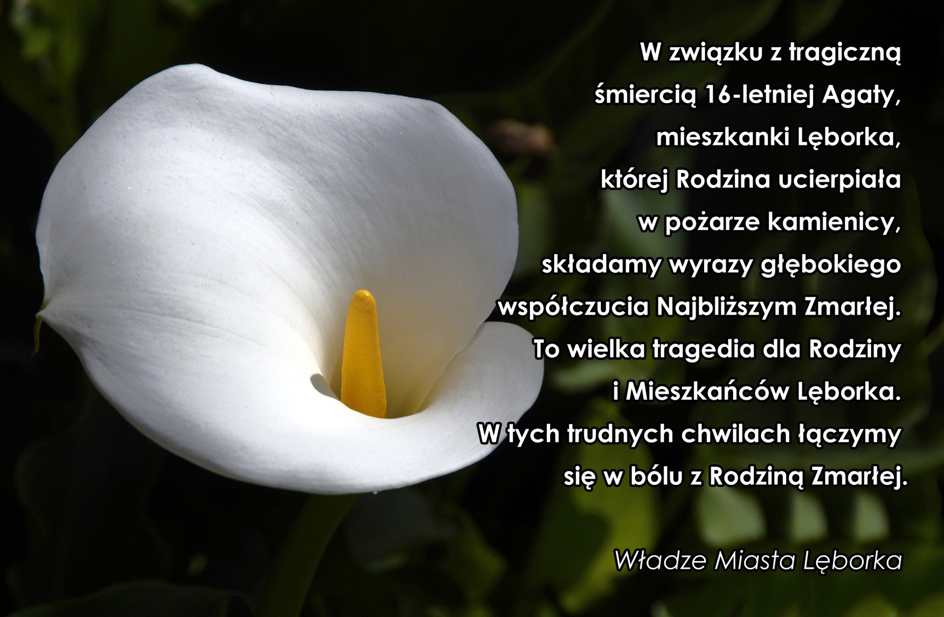 W związku z tragiczną śmiercią 16-letniej Agaty, mieszkanki Lęborka, której Rodzina ucierpiała w pożarze kamienicy, składamy wyrazy głębokiego współczucia Najbliższym Zmarłej. To wielka tragedia dla Rodziny i Mieszkańców Lęborka.