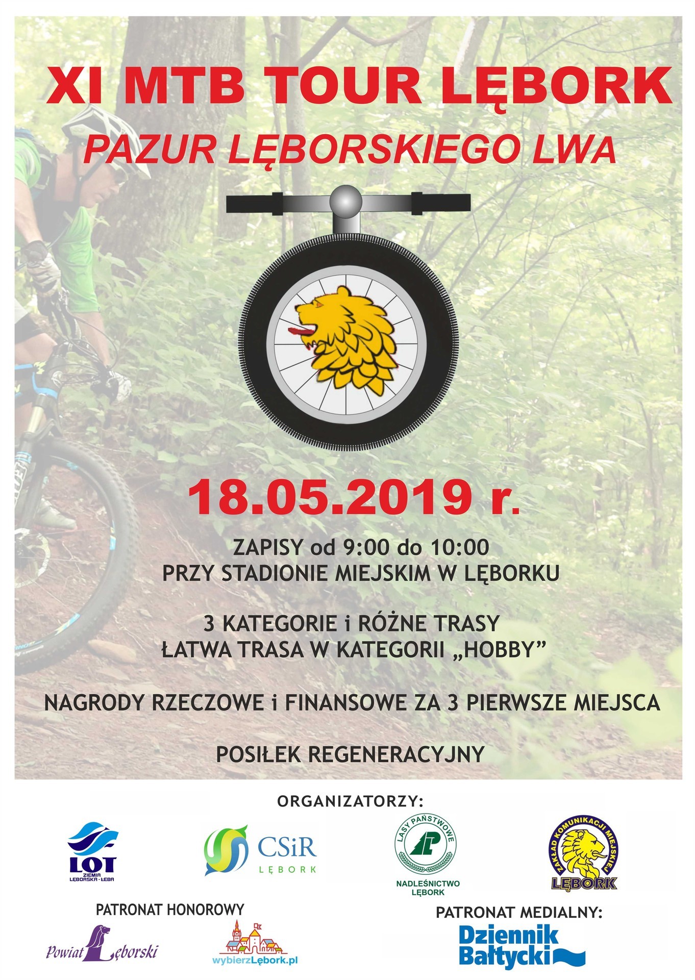 Serdecznie zapraszamy do udziału w XI MTB Tour Lębork Pazur Lęborskiego Lwa, który przeprowadzony zostanie 18 maja 2019r. w Lęborku. Wyścig Rowerowy MTB Pazur Lęborskiego Lwa jest imprezą otwartą. Mogą w niej startować amatorzy w różnym wieku i stopniu zaawansowania oraz zawodnicy zrzeszeni w klubach sportowych.