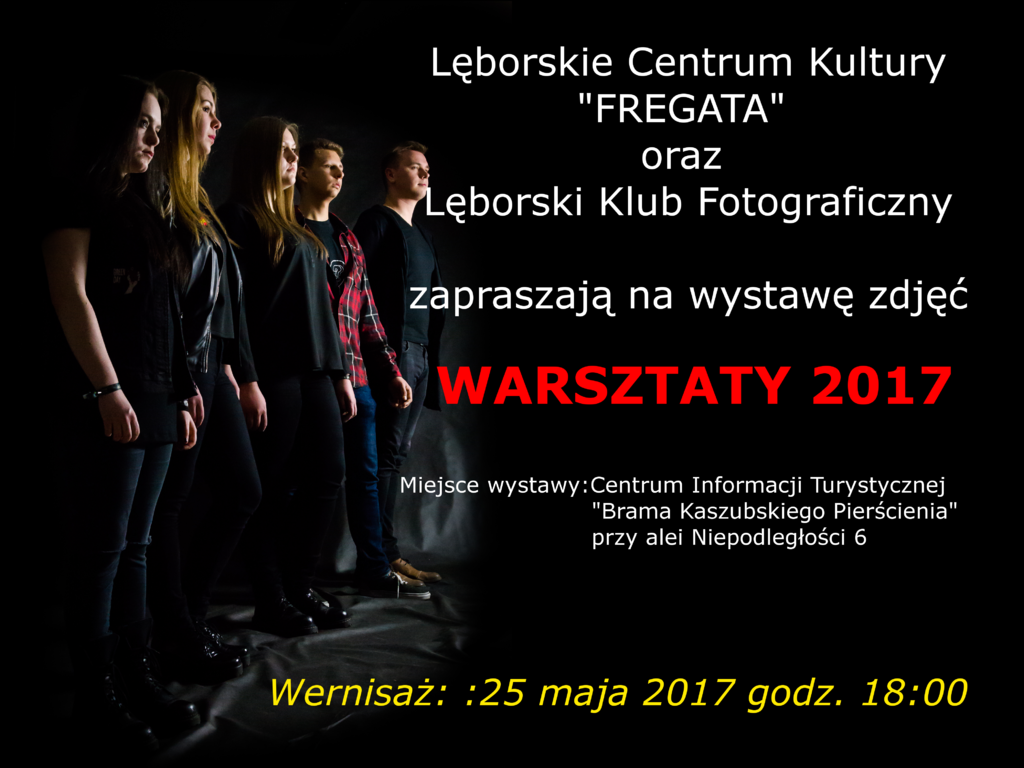 Lęborski Klub Fotograficzny działający przy Lęborskim Centrum Kultury „Fregata” zaprasza wszystkich miłośników fotografii na wernisaż swojej najnowszej wystawy pod tytułem „Warsztaty 2017” do Centrum Informacji Turystycznej „Brama Kaszubskiego Pierścienia” przy alei Niepodległości 6 w czwartek, 25 maja 2017. Rozpoczęcie wernisażu o godzinie 18.00. Wstęp wolny.
