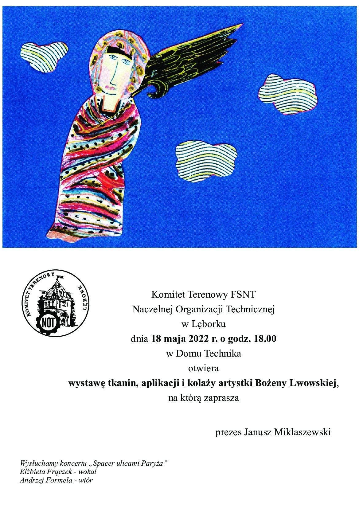 Komitet Terenowy Naczelnej Organizacji Technicznej w Lęborku zaprasza na wystawę tkanin, aplikacji i kolaży artystki Bożeny Lwowskiej, która otwarta zostanie w dniu 18 maja o godz. 18.00 w Domu Technika – w baszcie NOT przy ul. Korczaka. Otwarciu wystawy towarzyszył będzie koncert “Spacer ulicami Paryża” w wykonaniu Elżbiety Frączek (wokal) i Andrzeja Formeli (akompaniament).