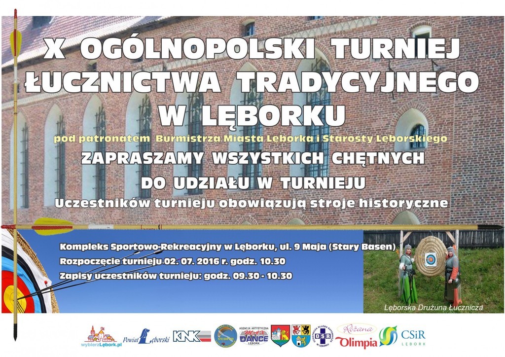 X Turniej Łucznictwa Tradycyjnego w Lęborku organizuje 2 lipca br. Lęborska Drużyna Łucznicza. Turniej odbędzie się na terenie Kompleksu Sportowo-Rekreacyjnego w Lęborku, ul. 9 Maja (Stary Basen). Rozpoczęcie turnieju godz. 10.30. Zapisy uczestników turnieju: godz. 9.30 - 10.30.