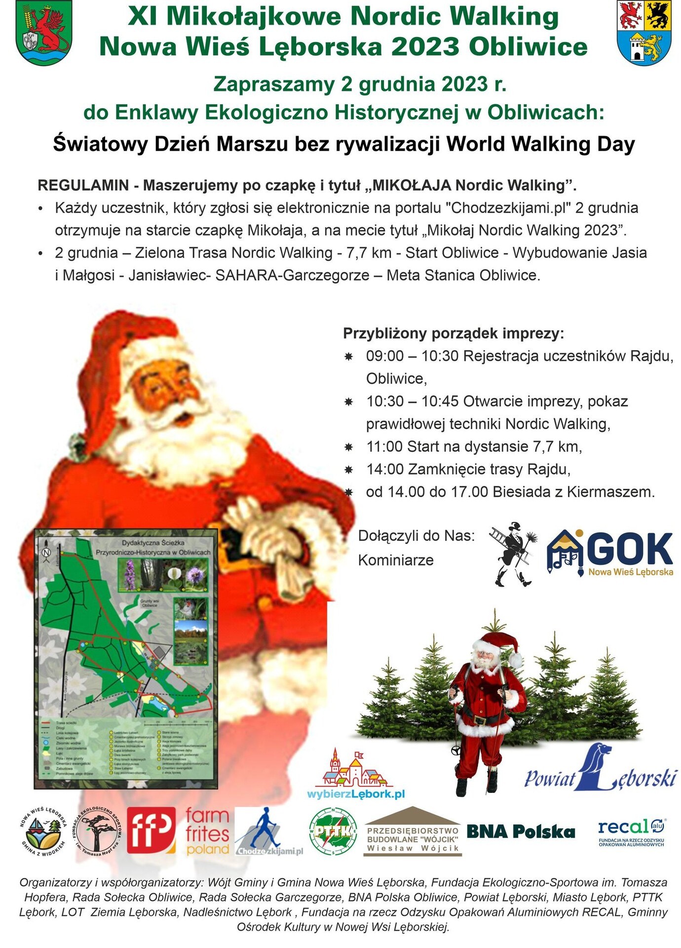 Zapraszamy na XI Mikołajkowy Marsz Nordic Walking z okazji Światowego Dnia Marszu Bez Rywalizacji w Oblicach - Nowa Wieś Lęborska. Wydarzenie odbędzie się 2 grudnia, start o godzinie 11:00 na zielonej trasie o długości 7,7 km.