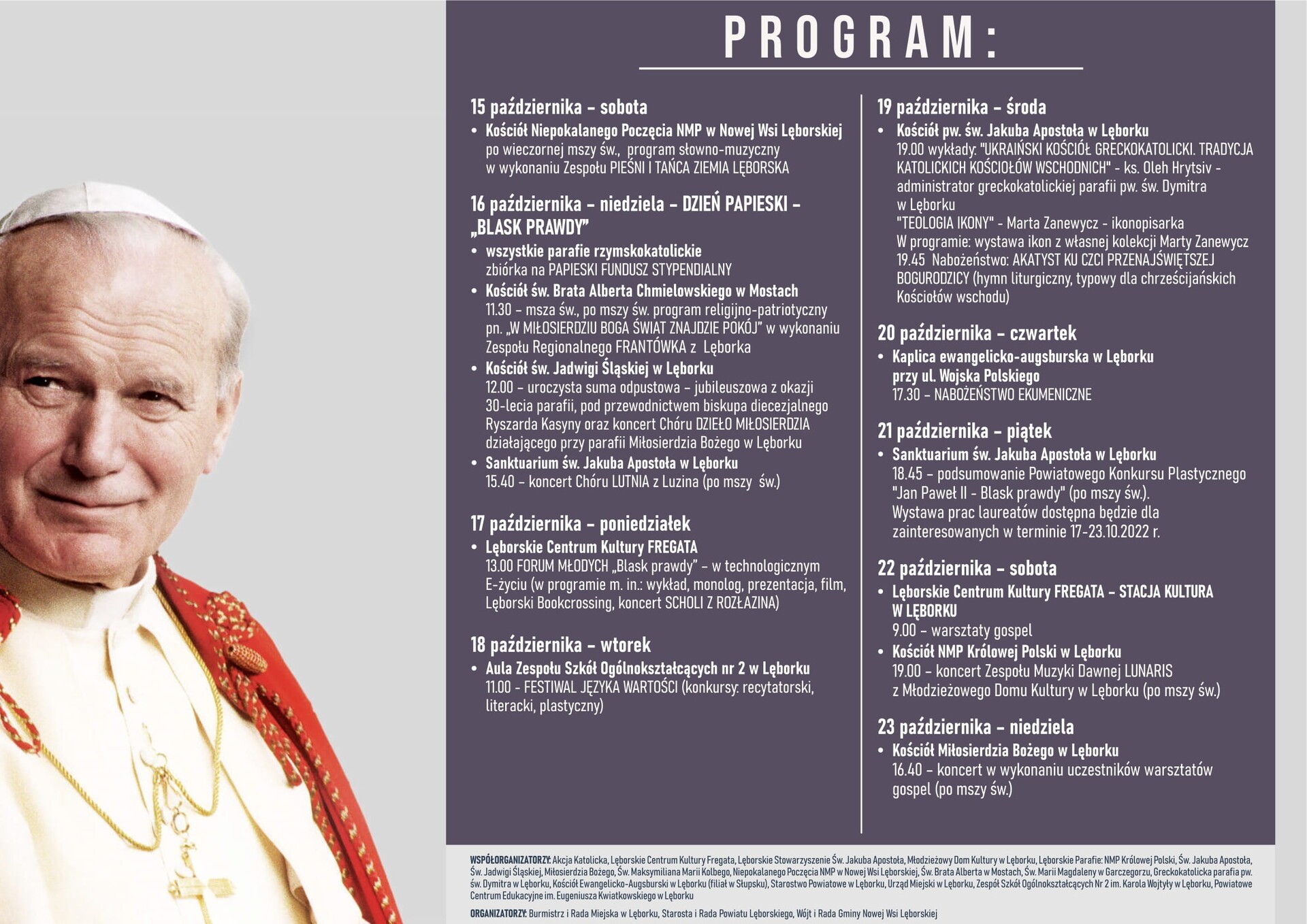 W dniach 15-23 października 2022 r. odbywać się będą wydarzenia w ramach tegorocznego, 19. Lęborskiego Tygodnia Kultury Chrześcijańskiej. Organizatorzy serdecznie zapraszają do uczestnictwa.