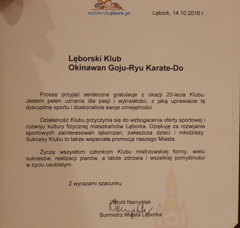 W sobotę 15 października na sali „Mechanika” z udziałem ponad 60 zawodników, w tym gości ze szkół karate z Wrocławia, Gdyni, Gdańska czy Niepoględzia odbyło się szkolenie Federacji Go Ju-Ryu Karate Do. Okazją do szkolenia i spotkania był jubileusz XX-lecia istnienia lęborskiego Klubu Karate.