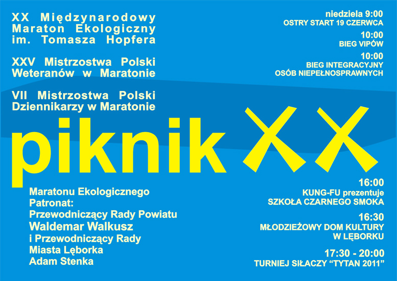 Zgłoszenia przyjmuje do dnia 17.06.2011 Fundacja Ekologiczno-Sportowa, 84-351 Nowa Wieś Lęborska, ul. Grunwaldzka 24, tel. 59 8612 414, 8612 167, e-mail: maraton.lebork [AT] wp [DOT] pl