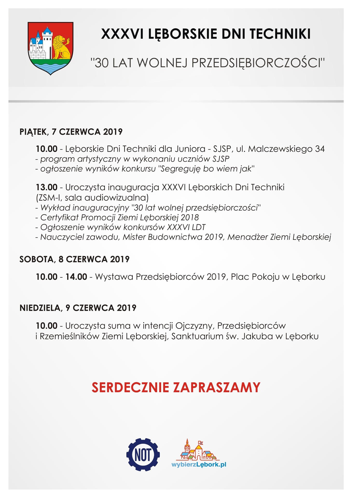 7 czerwca 2019 o godz. 13.00 w Sali audiowizualnej ZSM-I nastąpi inauguracja tegorocznej, 36 już edycji Lęborskich Dni Techniki, które w tym roku odbywać się będą pod hasłem „30 LAT WOLNEJ PRZEDSIĘBIORCZOŚCI.