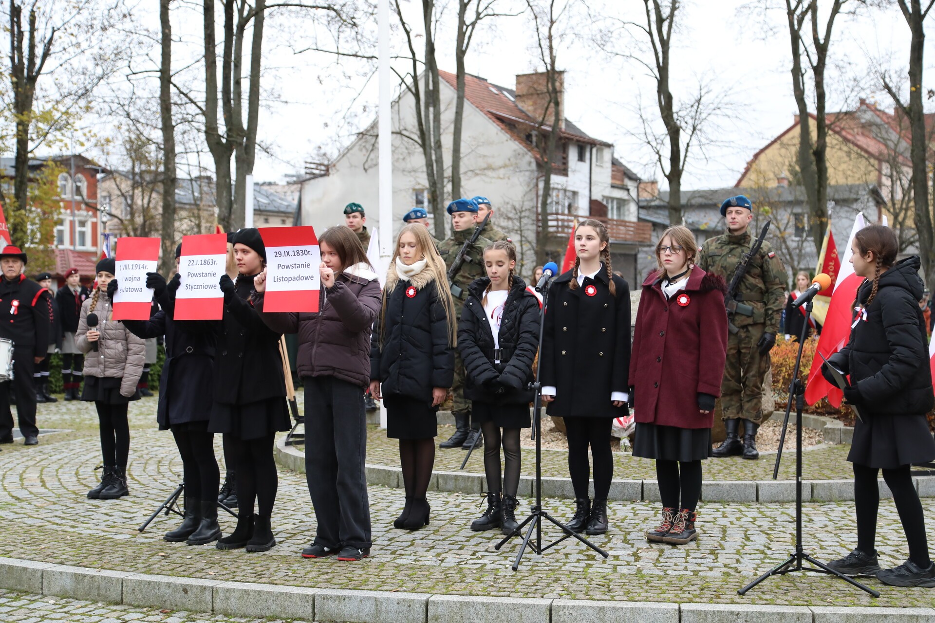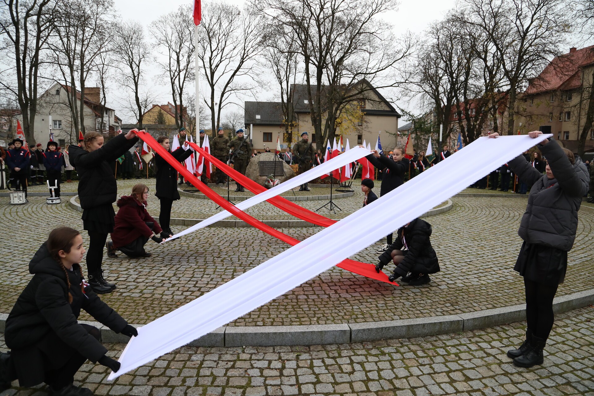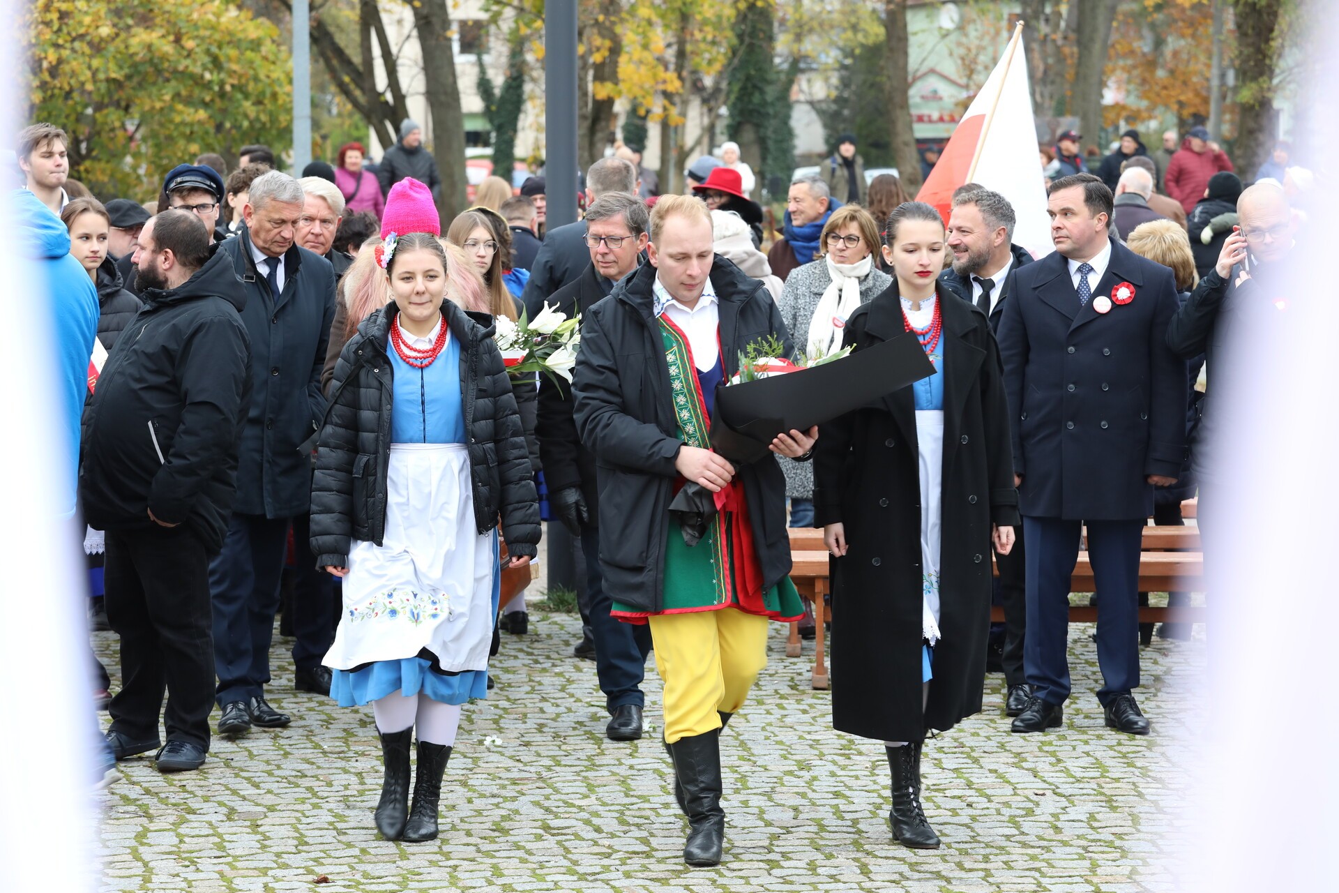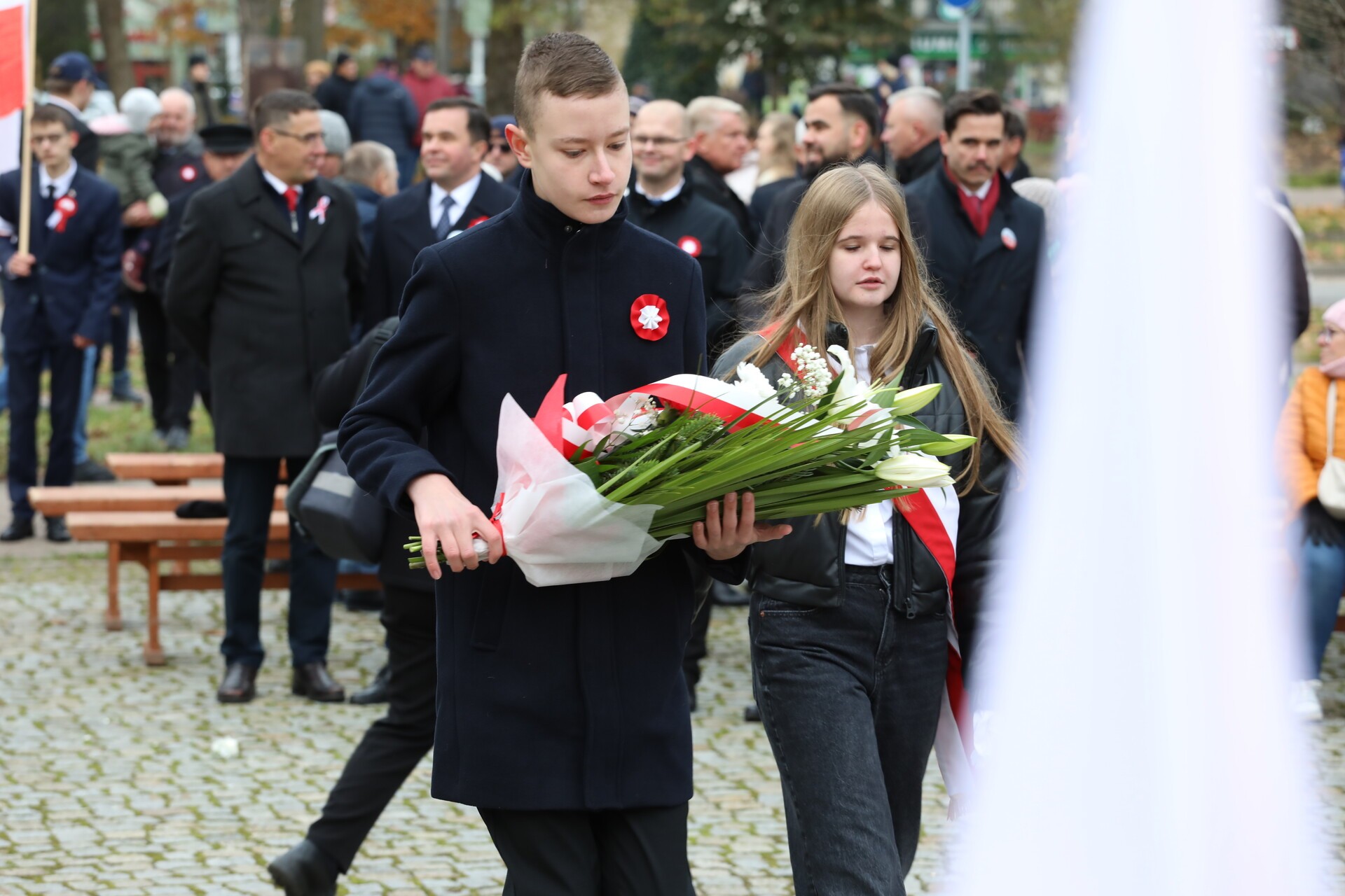 Po zakończeniu liturgii, w rytm marszowej muzyki granej przez Orkiestrę Dętą „Ziemia Lęborska”, wyruszył pochód na Skwer Orła Białego. Przy Obelisku Niepodległości przed lęborczanami i gośćmi uroczystości wystąpili z montażem słowno – muzycznym uczennice i uczniowie ze Szkoły Podstawowej Nr 3 im. Olimpijczyków Polskich, których do występu przygotowała nauczycielka Mirosława Grynkiewicz. W wierszu i w piosence motywem przewodnim był orzeł biały z polskiego godła.