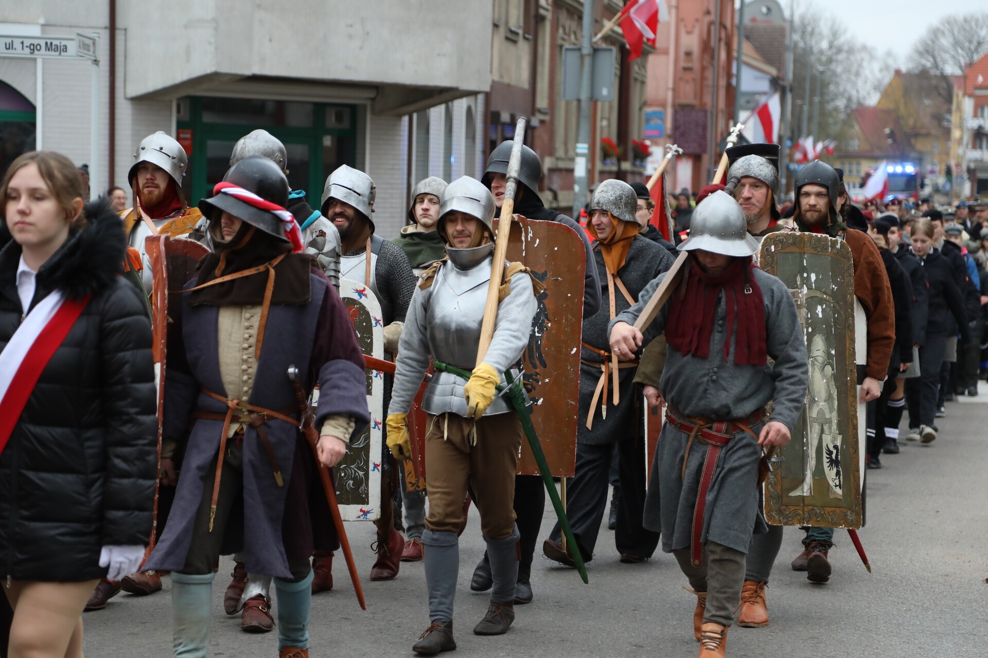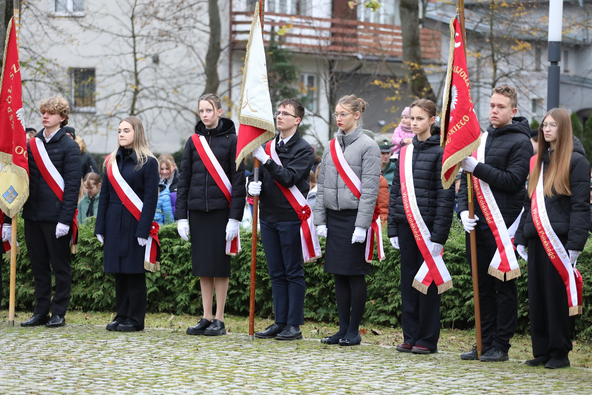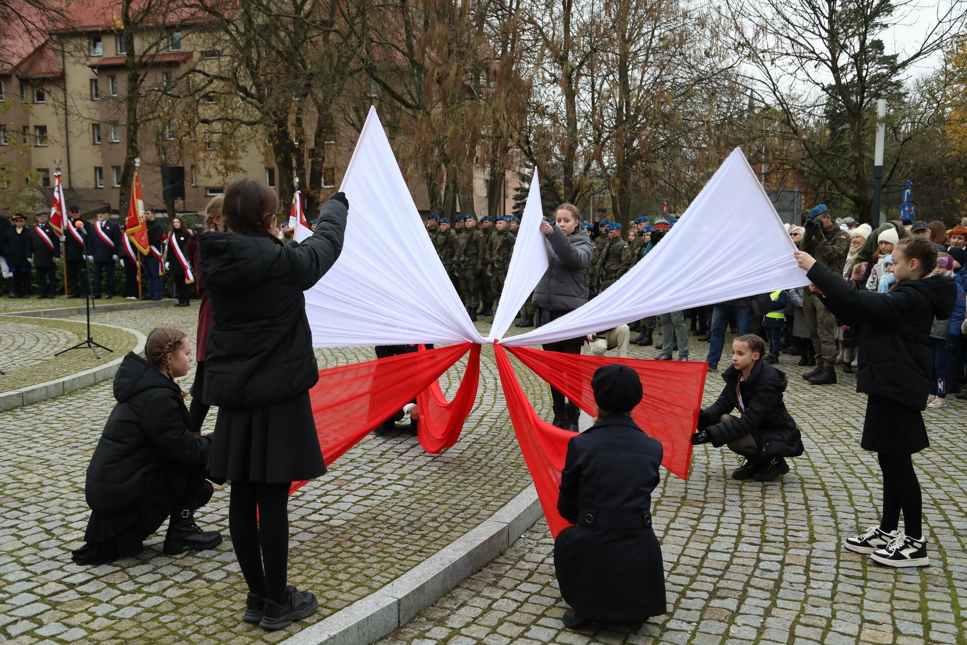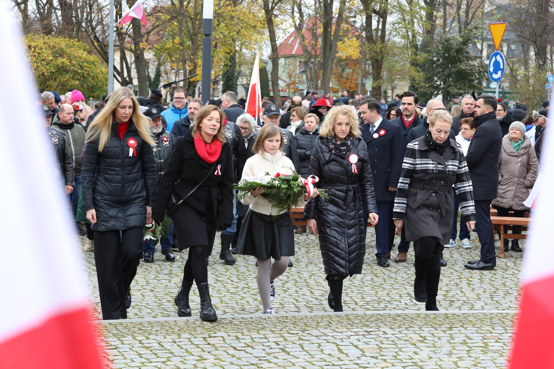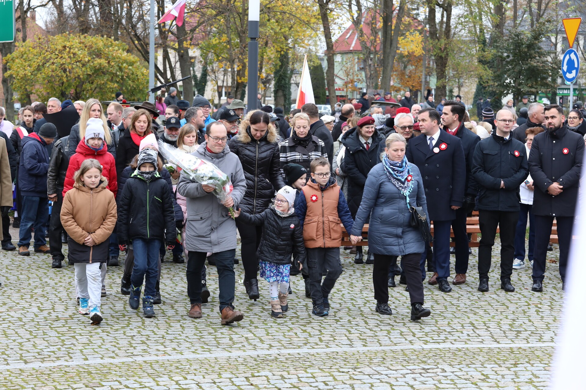 Po zakończeniu liturgii, w rytm marszowej muzyki granej przez Orkiestrę Dętą „Ziemia Lęborska”, wyruszył pochód na Skwer Orła Białego. Przy Obelisku Niepodległości przed lęborczanami i gośćmi uroczystości wystąpili z montażem słowno – muzycznym uczennice i uczniowie ze Szkoły Podstawowej Nr 3 im. Olimpijczyków Polskich, których do występu przygotowała nauczycielka Mirosława Grynkiewicz. W wierszu i w piosence motywem przewodnim był orzeł biały z polskiego godła.