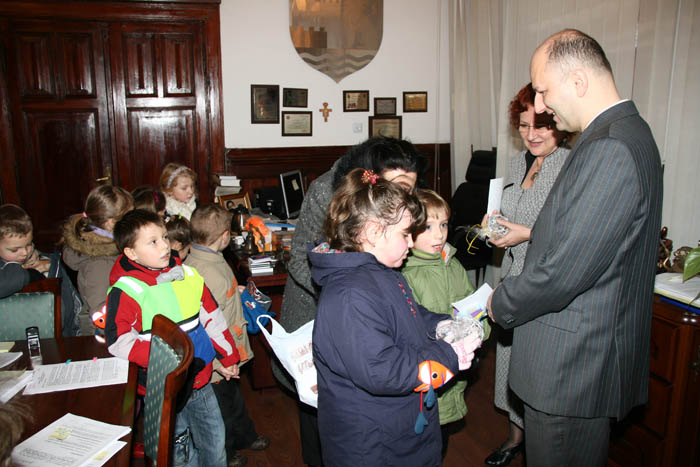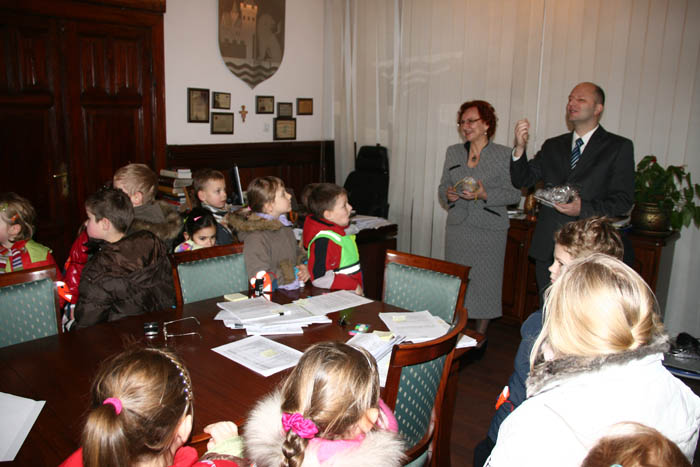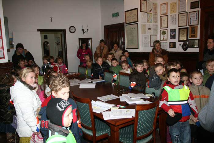 Dzieci złożyły życzenia burmistrzowi miasta Włodzimierzowi Klacie, zastępcy burmistrza Alicji Zajączkowskiej i pracownikom Urzędu oraz przekazały podarunki - wykonane własnoręcznie bombki. Wykonały kolędę, a na zakończenie obdarowane zostały przez Burmistrza słodyczami.